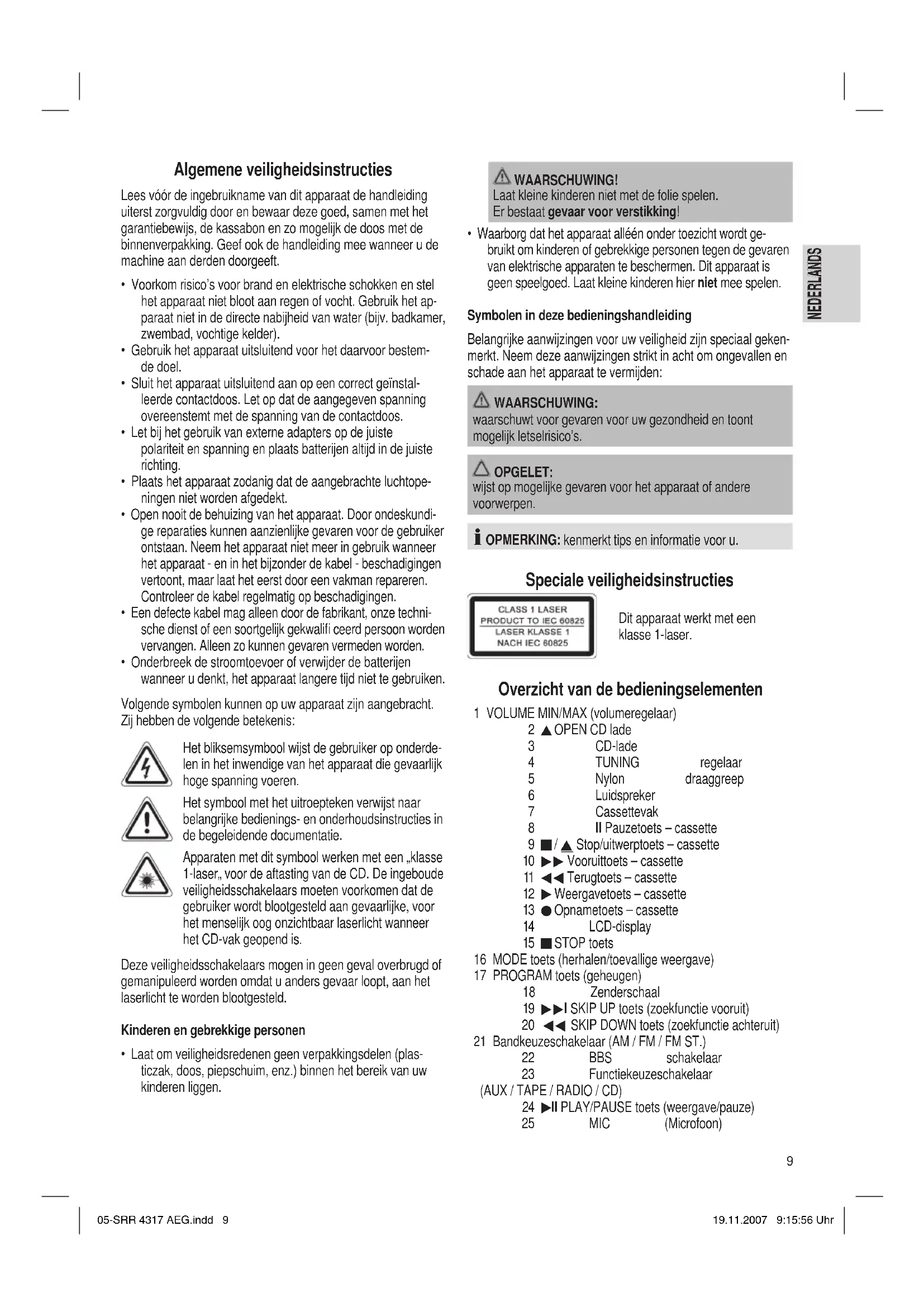 - Sproei géén reinigingsmiddelen of antistatische sprays op de CD zoals bij platenspelers. Verhelpen van storingen Symptomen Oorzaak Oplossing CD kan niet worden weergegeven. CD is niet of niet correct geplaatst. Controleer of de disc met het op- schrift naar boven is geplaatst. Batterijen te zwak. Plaats nieuwe batterijen of gebruik het apparaat met de netkabel. CD springt tijdens de weergave. Controleer de CD op vingerafdrukken, vuil of krassen. Reinig de CD vanu- it het midden met een zachte doek. Technische gegevens Model: ......................................................... SRR 4317 CD/MP3 Spanningstoevoer: ................................................. 230 V, 50 Hz Batterijvoeding: ..................................10 x 1,5 V, Typ UM1 / R20 Uitgangsvermogen: ..............................................400 W PMPO Beschermingsklasse: ................................................................ΙΙ Radio-element: Frequentiebereiken: ..................UKW / FM 88 ~ 108,0 MHz .....................MW / AM 540 ~ 1600 kHz Nettogewicht: .....................................................................7,2 kg Dit apparaat is gekeurd conform de op dit moment van toepas- sing zijnde CE-richtlijnen zoals bijvoorbeeld elektromagnetische compatibiliteit en laagspanningsvoorschriften en is gecon- strueerd volgens de nieuwste veiligheidstechnische voorschrif- ten. Technische wijzigingen voorbehouden! Garantie Voor het door ons geleverde apparaat verlenen wij een garantie van 24 maanden vanaf koopdatum (kassabon). Eventuele gebreken aan het apparaat of aan het toebehoren die zijn ontstaan door productie- of materiaalfouten verhelpen wij binnen deze periode kosteloos door middel van reparatie of, naar ons oordeel, door vervanging. Eventuele garantiegevallen verlengen noch de geldigheidsduur van de garantie, noch begint daardoor een nieuwe garantieperiode! Het koopbewijs geldt als garantiebewijs. Zonder dit bewijs kan geen kosteloze reparatie of vervanging plaatsvinden. Geef in garantiegevallen het complete apparaat in de originele verpakking samen met de kassabon af bij uw handelaar. Niet alleen defecten aan de hulpstukken of aan de slijtende onderdelen, maar ook reiniging, onderhoud of de vervanging van slijtende delen vallen niet onder de garantie en geschieden altijd tegen berekening! Bij ingrepen door derden komt de garantieverlening te vervallen. Na de garantieperiode Na afl oop van de garantieperiode kunnen reparaties tegen ber- ekening worden uitgevoerd door de betreffende vakhandelaar of de technische dienst. Betekenis van het symbool ‘vuilnisemmer’ Bescherm ons milieu, elektrische apparaten horen niet in het huisafval. Maak voor het afvoeren van elektrische apparaten gebruik van de voorgeschreven verzamelpunten en geef daar de elektrische apparaten af die u niet meer gebruikt. Daardoor helpt u de potentiële effecten te voorkomen die een verkeerde afvoer op het milieu en de menselijke gezondheid kunnen hebben. Op deze wijze levert u uw bijdrage aan het hergebruik, de recycling en andere verwerkingsvormen voor oude elektronische en elektrische apparaten. Voor informatie over verzamelpunten voor uw apparaten kunt u contact opnemen met uw gemeente of gemeenteadministratie. 05-SRR 4317 AEG.indd 1305-SRR 4317 AEG.indd 13 19.11.2007 9:15:57 Uhr19.11.2007 9:15:57 Uhr14 FRANÇAIS FRANÇAIS Conseils généraux de sécurité Lisez attentivement ce mode d’emploi avant de mettre l’appareil en marche pour la première fois. Conservez le mode d’emploi ainsi que le bon de garantie, votre ticket de caisse et si possible, le carton avec l’emballage se trouvant à l’intérieur. Si vous remettez l‘appareil à des tiers, veuillez-le remettre avec son mode d‘emploi.