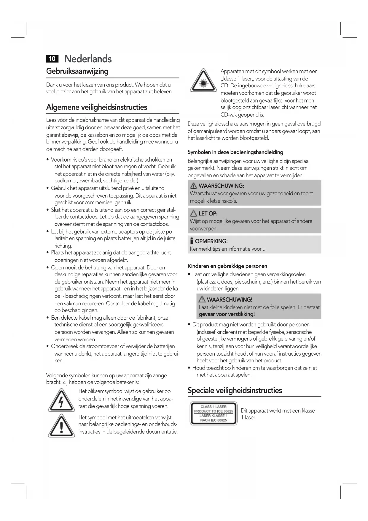 - Onderbreek de stroomtoevoer of verwder de batteren wanneer u denkt, het apparaat langere tijd niet te gebrui- ken. Volgende symbolen kunnen op uw apparaat zijn aange- bracht. Zij hebben de volgende betekenis: Het bliksemsymbool wijst de gebruiker op onderdelen in het inwendige van het appa- raat die gevaarlijk hoge spanning voeren. Het symbool met het uitroepteken verwijst naar belangrijke bedienings- en onderhouds- instructies in de begeleidende documentatie. Apparaten met dit symbool werken met een „klasse 1-laser„ voor de aftasting van de CD. De ingebouwde veiligheidsschakelaars moeten voorkomen dat de gebruiker wordt blootgesteld aan gevaarlijke, voor het men- selijk oog onzichtbaar laserlicht wanneer het CD-vak geopend is. Deze veiligheidsschakelaars mogen in geen geval overbrugd of gemanipuleerd worden omdat u anders gevaar loopt, aan het laserlicht te worden blootgesteld. Symbolen in deze bedieningshandleiding Belangrijke aanwijzingen voor uw veiligheid zijn speciaal gekenmerkt. Neem deze aanwijzingen strikt in acht om ongevallen en schade aan het apparaat te vermijden: WAARSCHUWING: Waarschuwt voor gevaren voor uw gezondheid en toont mogelijk letselrisico’s. LET OP: Wijst op mogelijke gevaren voor het apparaat of andere voorwerpen. OPMERKING: Kenmerkt tips en informatie voor u. Kinderen en gebrekkige personen