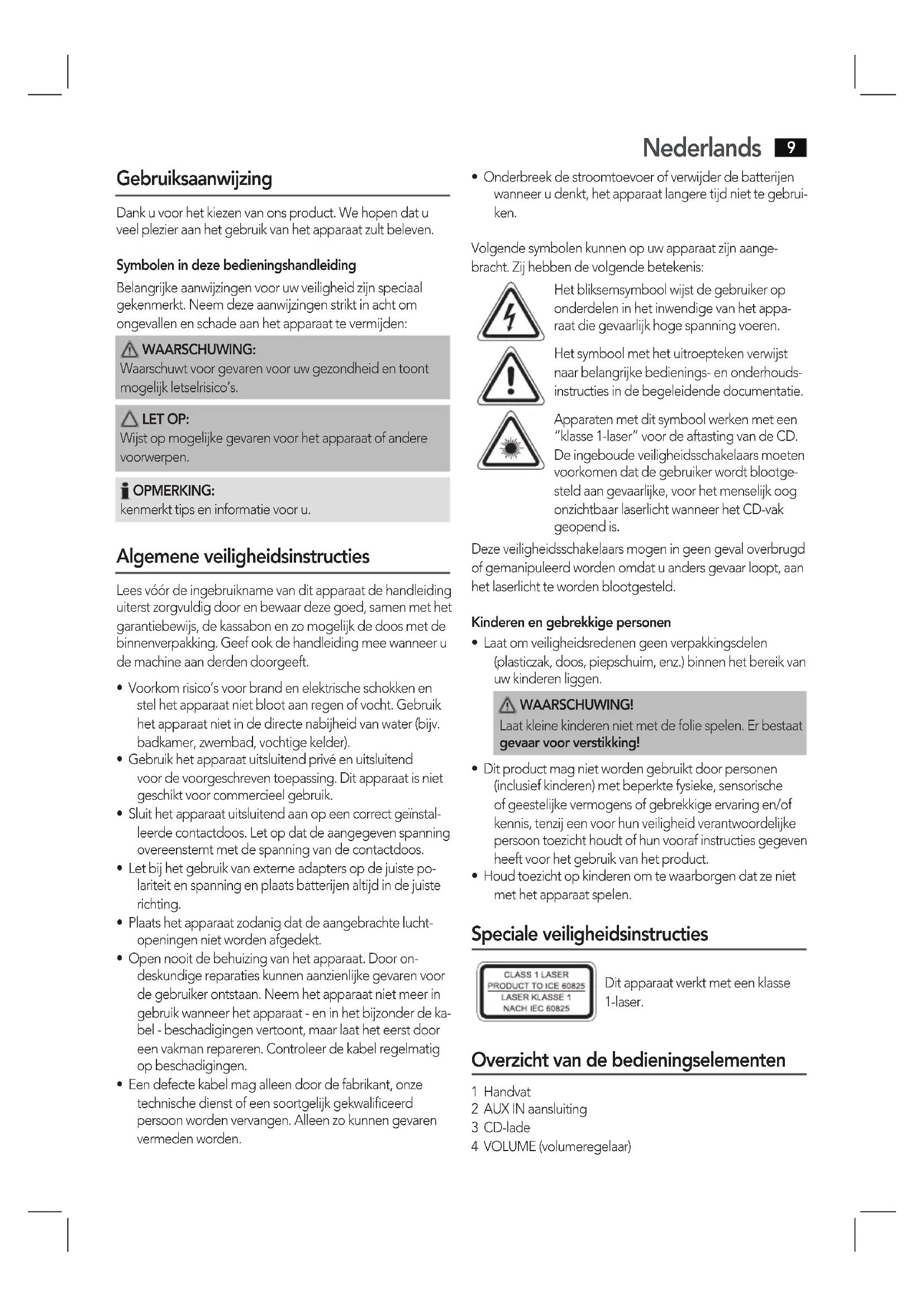 - Houd toezicht op kinderen om te waarborgen dat ze niet met het apparaat spelen. Speciale veiligheidsinstructies Dit apparaat werkt met een klasse 1-laser. Overzicht van de bedieningselementen 1 Handvat 2 AUX IN aansluiting 3 CD-lade 4 VOLUME (volumeregelaar)Nederlands