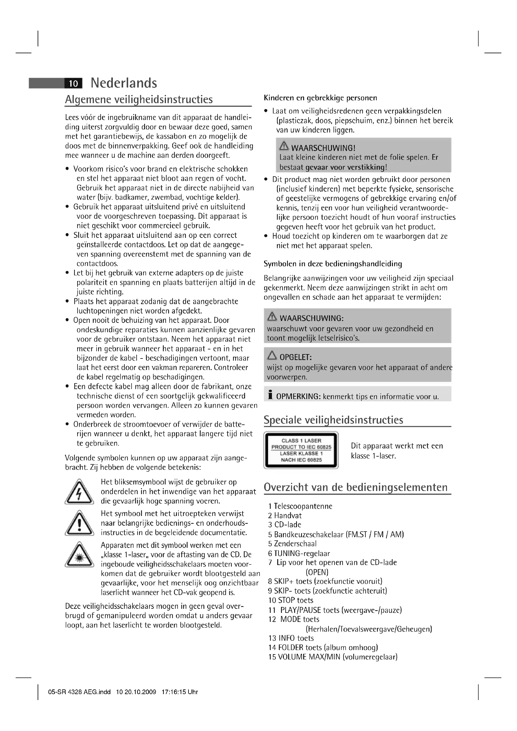 - Houd toezicht op kinderen om te waarborgen dat ze niet met het apparaat spelen. Symbolen in deze bedieningshandleiding Belangrijke aanwijzingen voor uw veiligheid zijn speciaal gekenmerkt. Neem deze aanwijzingen strikt in acht om ongevallen en schade aan het apparaat te vermijden: WAARSCHUWING: waarschuwt voor gevaren voor uw gezondheid en toont mogelijk letselrisico’s. OPGELET: wijst op mogelijke gevaren voor het apparaat of andere voorwerpen. OPMERKING: kenmerkt tips en informatie voor u. Speciale veiligheidsinstructies Dit apparaat werkt met een klasse 1-laser. Overzicht van de bedieningselementen 1 Telescoopantenne 2 Handvat 3 CD-lade 5 Bandkeuzeschakelaar (FM.ST / FM / AM) 5 Zenderschaal 6 TUNING-regelaar 7 Lip voor het openen van de CD-lade (OPEN) 8 SKIP+ toets (zoekfunctie vooruit) 9 SKIP- toets (zoekfunctie achteruit) 10 STOP toets 11 PLAY/PAUSE toets (weergave-/pauze) 12 MODE toets (Herhalen/Toevalsweergave/Geheugen) 13 INFO toets 14 FOLDER toets (album omhoog) 15 VOLUME MAX/MIN (volumeregelaar) 05-SR 4328 AEG.indd 10 20.10.2009 17:16:15 UhrNederlands