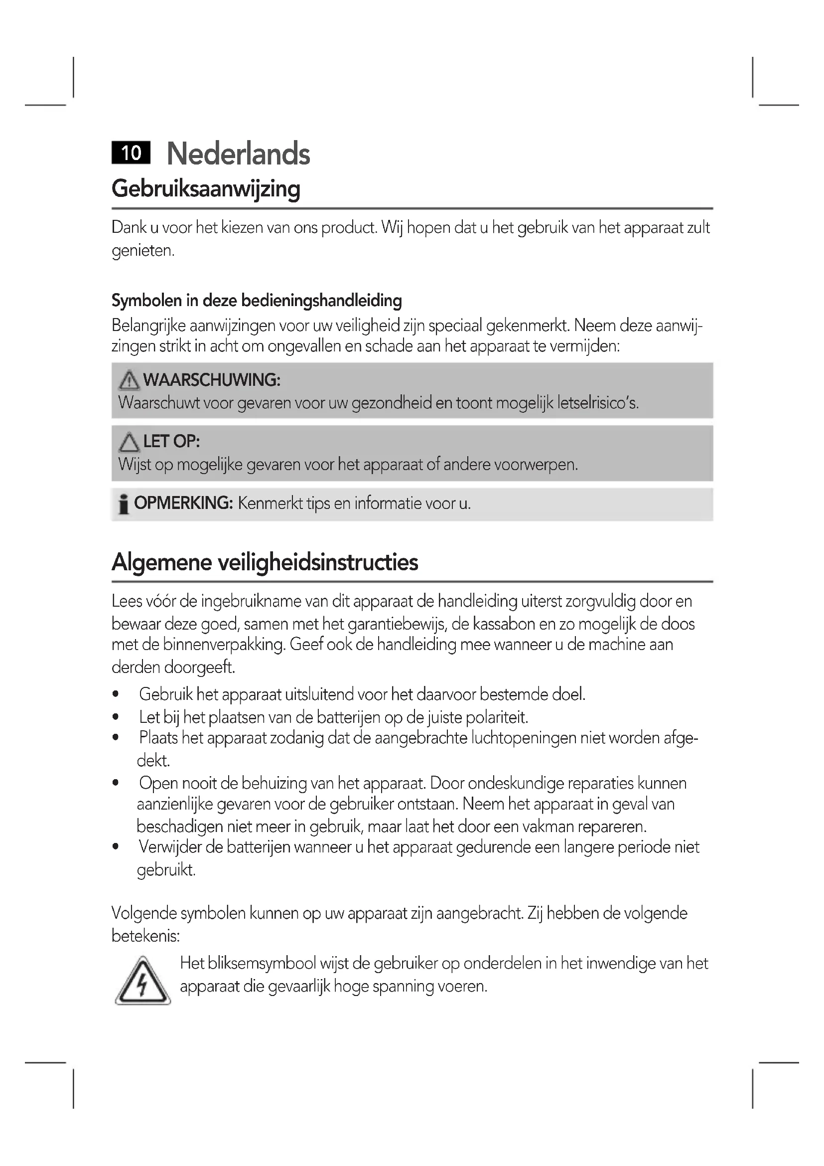 - Verwderdebatterenwanneeruhetapparaatgedurendeeenlangereperiodeniet gebruikt. Volgende symbolen kunnen op uw apparaat zijn aangebracht. Zij hebben de volgende betekenis: Het bliksemsymbool wijst de gebruiker op onderdelen in het inwendige van het apparaat die gevaarlijk hoge spanning voeren.Nederlands