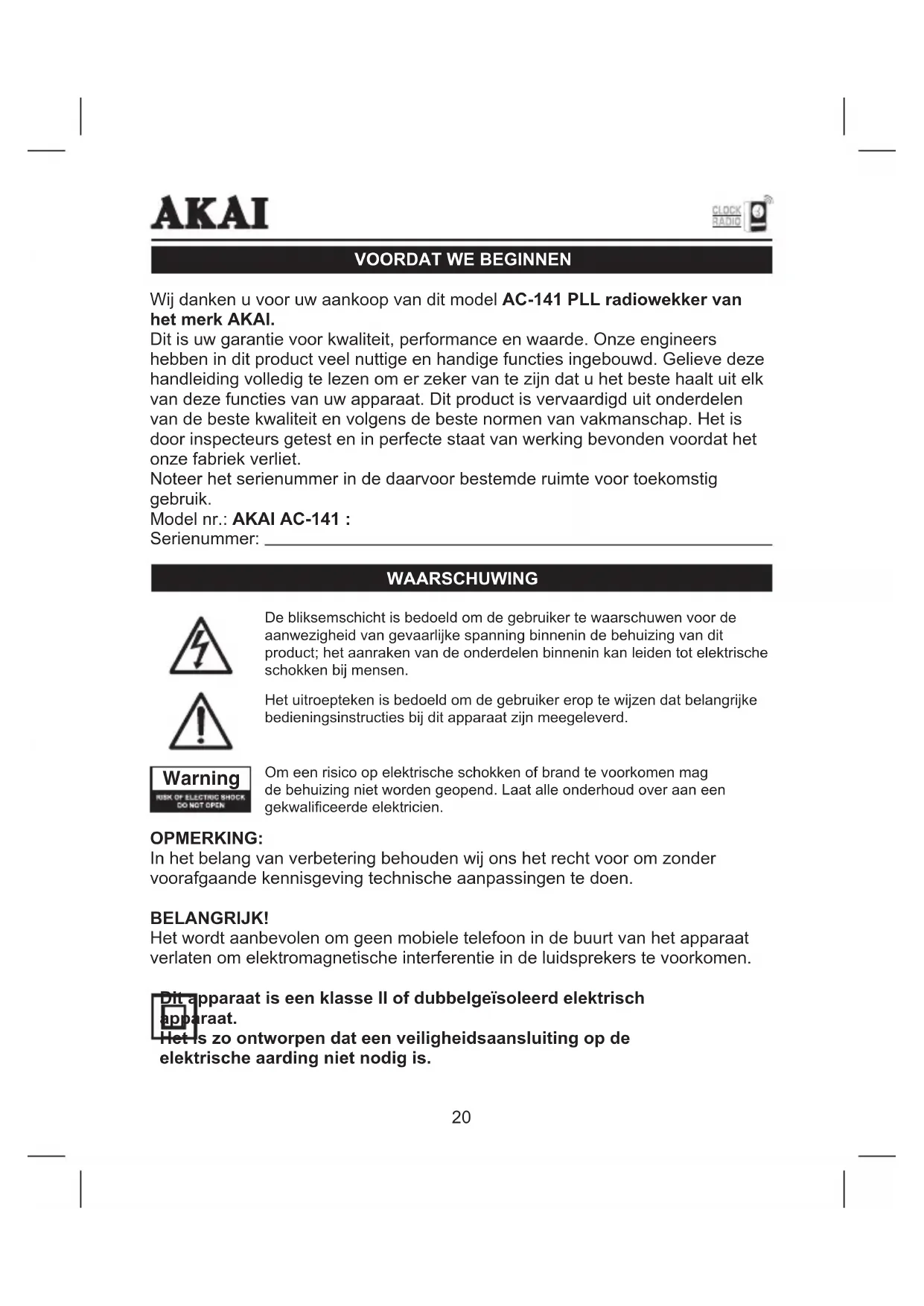 Wij danken u voor uw aankoop van dit model AC-141 PLL radiowekker van het merk AKAI. Dit is uw garantie voor kwaliteit, performance en waarde. Onze engineers hebben in dit product veel nuttige en handige functies ingebouwd. Gelieve deze handleiding volledig te lezen om er zeker van te zijn dat u het beste haalt uit elk van deze functies van uw apparaat. Dit product is vervaardigd uit onderdelen van de beste kwaliteit en volgens de beste normen van vakmanschap. Het is door inspecteurs getest en in perfecte staat van werking bevonden voordat het onze fabriek verliet. Noteer het serienummer in de daarvoor bestemde ruimte voor toekomstig gebruik. Model nr.: AKAI AC-141 : Serienummer: WAARSCHUWING OPMERKING: In het belang van verbetering behouden wij ons het recht voor om zonder voorafgaande kennisgeving technische aanpassingen te doen. BELANGRIJK! Het wordt aanbevolen om geen mobiele telefoon in de buurt van het apparaat verlaten om elektromagnetische interferentie in de luidsprekers te voorkomen. Dit apparaat is een klasse II of dubbelgeïsoleerd elektrisch apparaat. Het is zo ontworpen dat een veiligheidsaansluiting op de elektrische aarding niet nodig is. De bliksemschicht is bedoeld om de gebruiker te waarschuwen voor de aanwezigheid van gevaarlijke spanning binnenin de behuizing van dit product; het aanraken van de onderdelen binnenin kan leiden tot elektrische schokken bij mensen. Het uitroepteken is bedoeld om de gebruiker erop te wijzen dat belangrijke bedieningsinstructies bij dit apparaat zijn meegeleverd. Om een risico op elektrische schokken of brand te voorkomen mag de behuizing niet worden geopend. Laat alle onderhoud over aan een gekwaliceerde elektricien. WarningVEILIGHEIDSVOORZORGEN