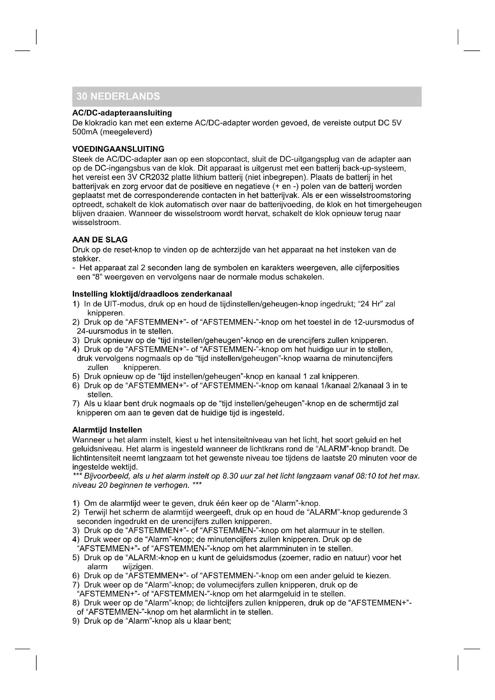 Steek de AC/DC-adapter aan op een stopcontact, sluit de DC-uitgangsplug van de adapter aan op de DC-ingangsbus van de klok. Dit apparaat is uitgerust met een batterij back-up-systeem, het vereist een 3V CR2032 platte lithium batterij (niet inbegrepen). Plaats de batterij in het batterijvak en zorg ervoor dat de positieve en negatieve (+ en -) polen van de batterij worden geplaatst met de corresponderende contacten in het batterijvak. Als er een wisselstroomstoring optreedt, schakelt de klok automatisch over naar de batterijvoeding, de klok en het timergeheugen blijven draaien. Wanneer de wisselstroom wordt hervat, schakelt de klok opnieuw terug naar wisselstroom.