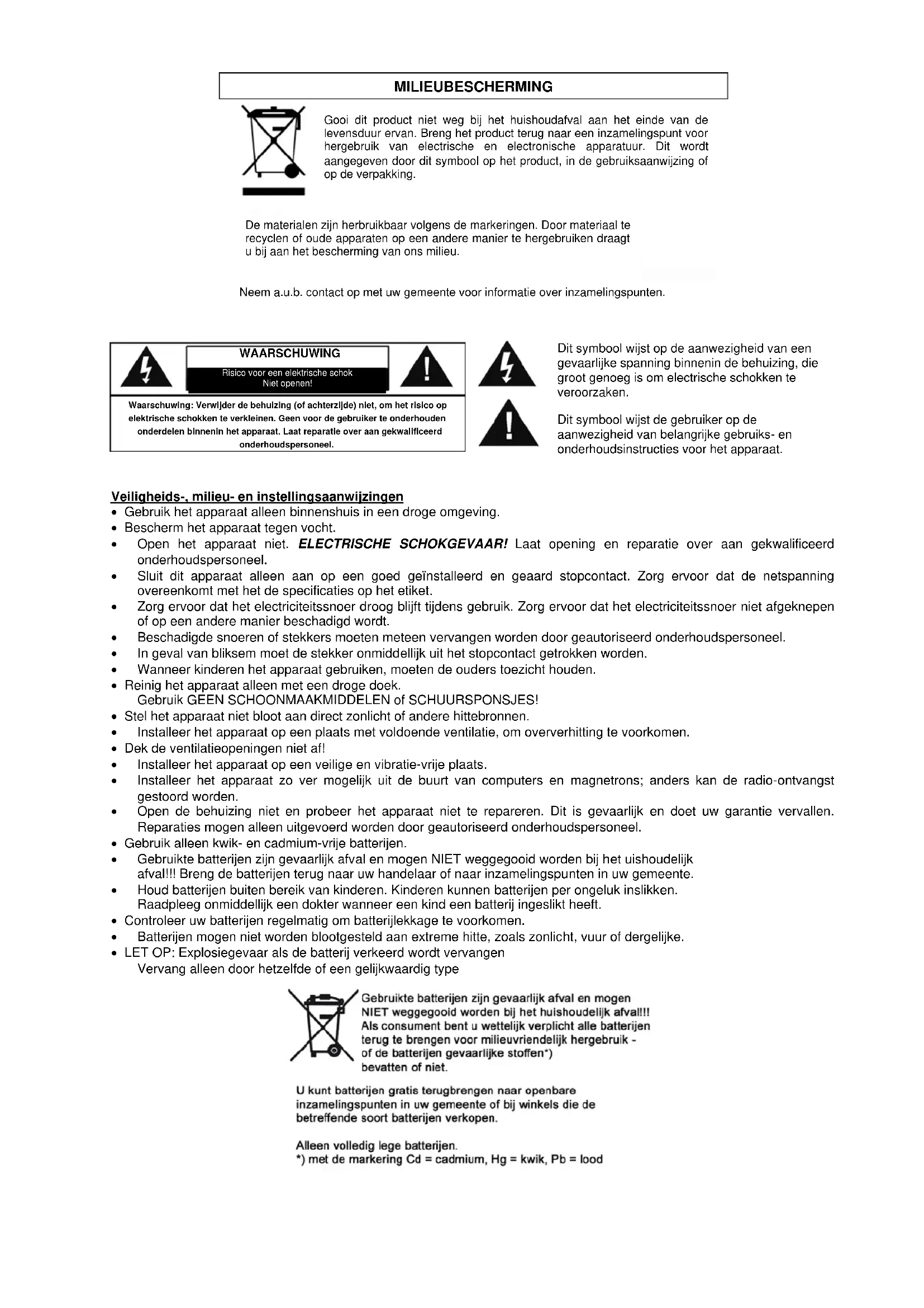 - Gebruik alleen kwik- en cadmium-vrije batterijen.