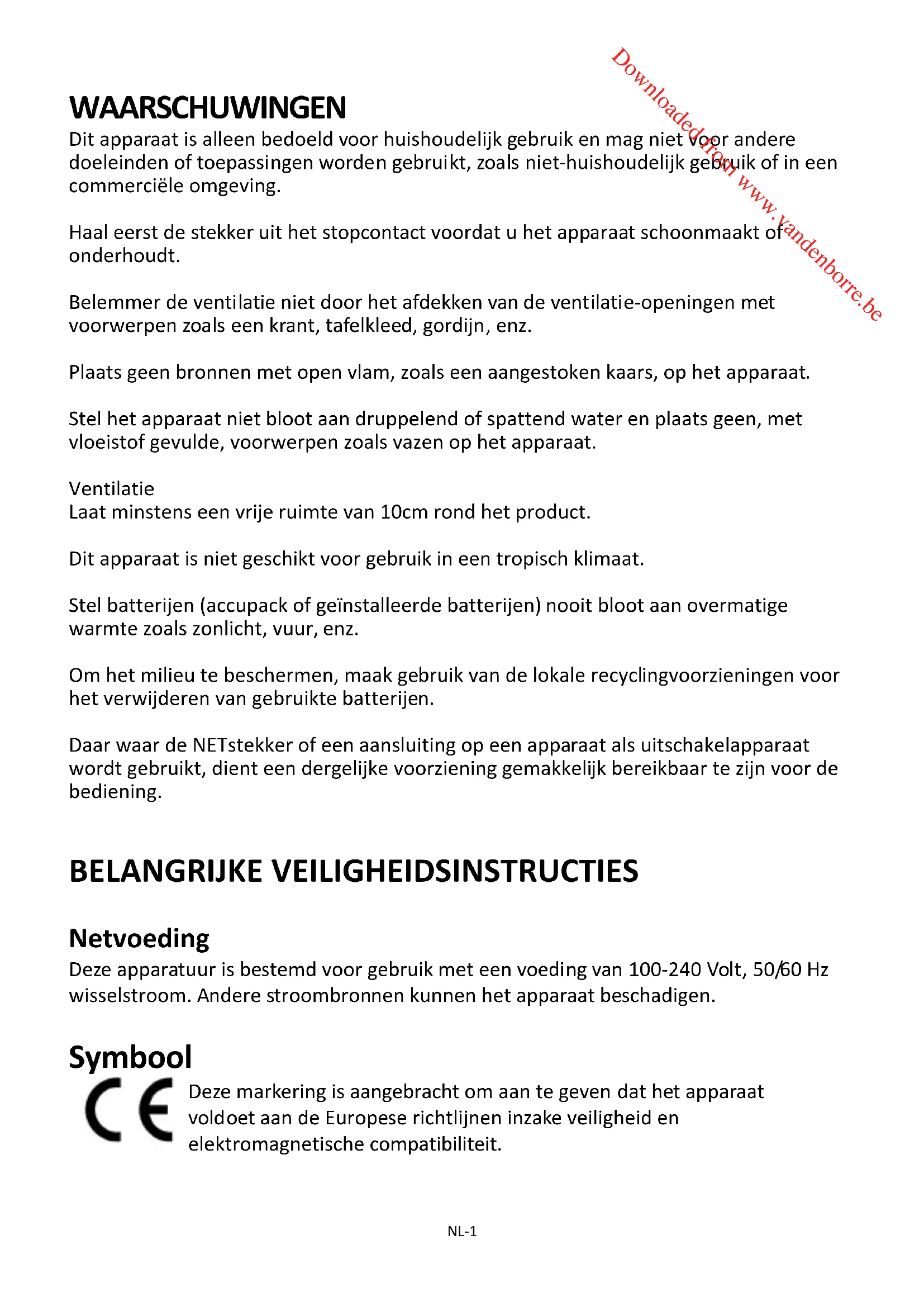 Downloaded from www.vandenborre.be NL‐2 Installatieengebruikvandebatterijen Alleenvolwassenenmogenhandelingenmetbatterijenuitvoeren.Eenkindmagdit apparaatalleengebruikenalshetbatterijdekselopdejuistemanierophetbatterijvak isbevestigd.