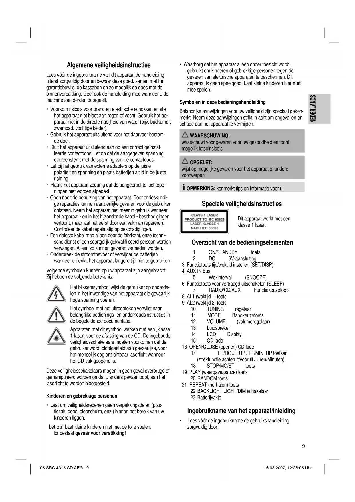 - Waarborg dat het apparaat alléén onder toezicht wordt gebruikt om kinderen of gebrekkige personen tegen de gevaren van elektrische apparaten te beschermen. Dit apparaat is geen speelgoed. Laat kleine kinderen hier niet mee spelen. Symbolen in deze bedieningshandleiding Belangrijke aanwijzingen voor uw veiligheid zijn speciaal geken- merkt. Neem deze aanwijzingen strikt in acht om ongevallen en schade aan het apparaat te vermijden: WAARSCHUWING: waarschuwt voor gevaren voor uw gezondheid en toont mogelijk letselrisico’s. OPGELET: wijst op mogelijke gevaren voor het apparaat of andere voorwerpen. OPMERKING: kenmerkt tips en informatie voor u. Speciale veiligheidsinstructies Dit apparaat werkt met een klasse 1-laser. Overzicht van de bedieningselementen 1 ON/STANDBY toets 2 DC 6V-aansluiting 3 Functietoets tijd/wektijd instellen (SET/DISP) 4 AUX IN Bus 5 Wekinterval (SNOOZE) 6 Functietoets voor vertraagd uitschakelen (SLEEP) 7 RADIO/CD/AUX Functiekeuzetoets 8 AL1 (wektijd 1) toets 9 AL2 (wektijd 2) toets 10 TUNING regelaar 11 MODE Bandkeuzetoets 12 VOLUME (volumeregelaar) 13 Luidspreker 14 LCD Display 15 CD-lade 16 OPEN/CLOSE (openen) CD-lade 17 FR/HOUR UP / FF/MIN. UP toetsen (zoekfunctie achteruit/vooruit / Uren/Minuten) 18 STOP/MO/ST toets 19 PLAY (weergave/pauze) toets 20 RANDOM toets 21 REPEAT (herhalen) toets 22 BACKLIGHT LIGHT/DIM schakelaar 23 Batterijvakje Ingebruikname van het apparaat/inleiding