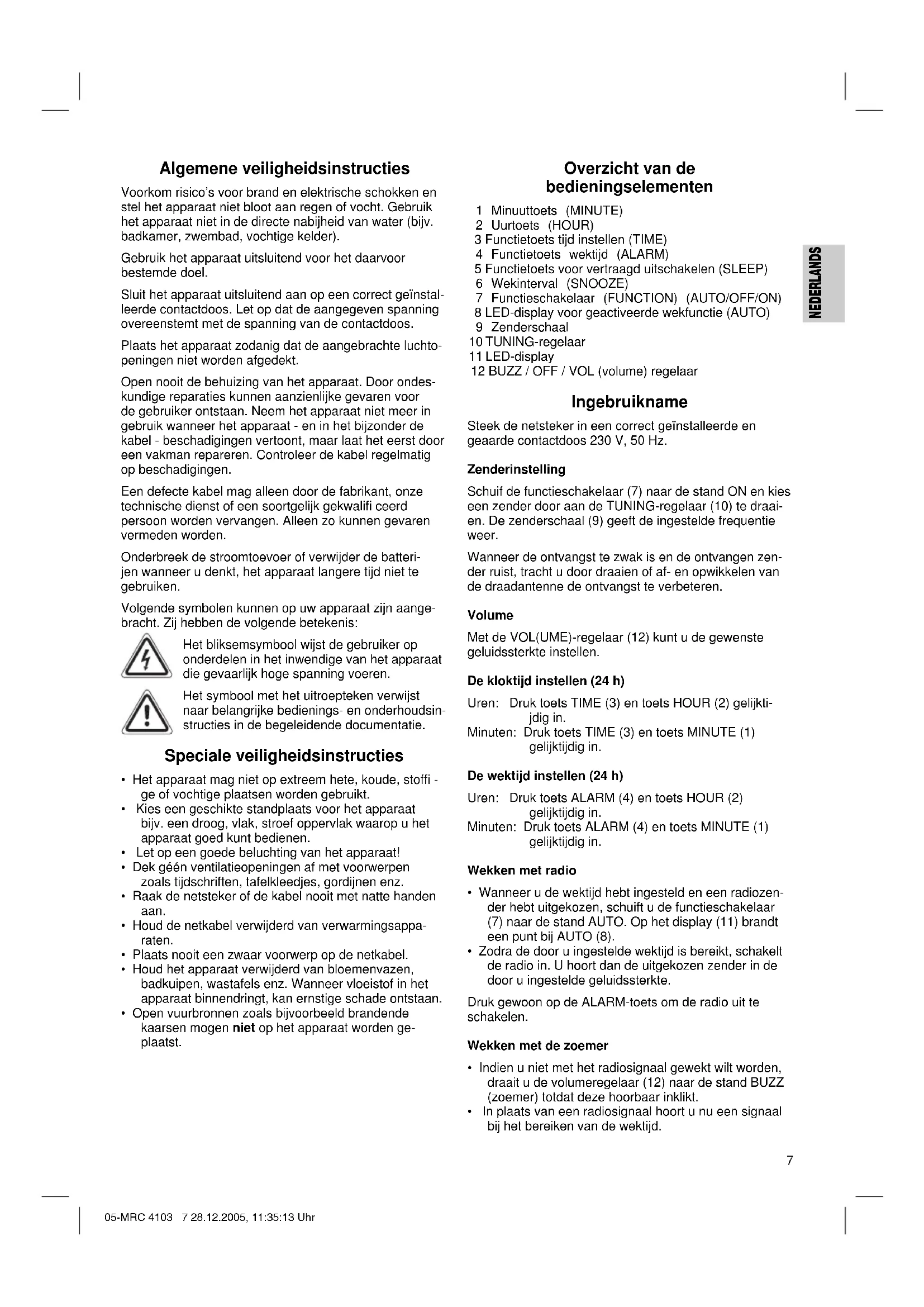 - Open vuurbronnen zoals bijvoorbeeld brandende kaarsen mogen niet op het apparaat worden ge- plaatst. Overzicht van de bedieningselementen 1 Minuuttoets (MINUTE) 2 Uurtoets (HOUR) 3 Functietoets tijd instellen (TIME) 4 Functietoets wektijd (ALARM) 5 Functietoets voor vertraagd uitschakelen (SLEEP) 6 Wekinterval (SNOOZE) 7 Functieschakelaar (FUNCTION) (AUTO/OFF/ON) 8 LED-display voor geactiveerde wekfunctie (AUTO) 9 Zenderschaal 10 TUNING-regelaar 11 LED-display 12 BUZZ / OFF / VOL (volume) regelaar Ingebruikname Steek de netsteker in een correct geïnstalleerde en geaarde contactdoos 230 V, 50 Hz. Zenderinstelling Schuif de functieschakelaar (7) naar de stand ON en kies een zender door aan de TUNING-regelaar (10) te draai- en. De zenderschaal (9) geeft de ingestelde frequentie weer. Wanneer de ontvangst te zwak is en de ontvangen zen- der ruist, tracht u door draaien of af- en opwikkelen van de draadantenne de ontvangst te verbeteren. Volume Met de VOL(UME)-regelaar (12) kunt u de gewenste geluidssterkte instellen. De kloktijd instellen (24 h) Uren: Druk toets TIME (3) en toets HOUR (2) gelijkti- jdig in. Minuten: Druk toets TIME (3) en toets MINUTE (1) gelijktijdig in. De wektijd instellen (24 h) Uren: Druk toets ALARM (4) en toets HOUR (2) gelijktijdig in. Minuten: Druk toets ALARM (4) en toets MINUTE (1) gelijktijdig in. Wekken met radio