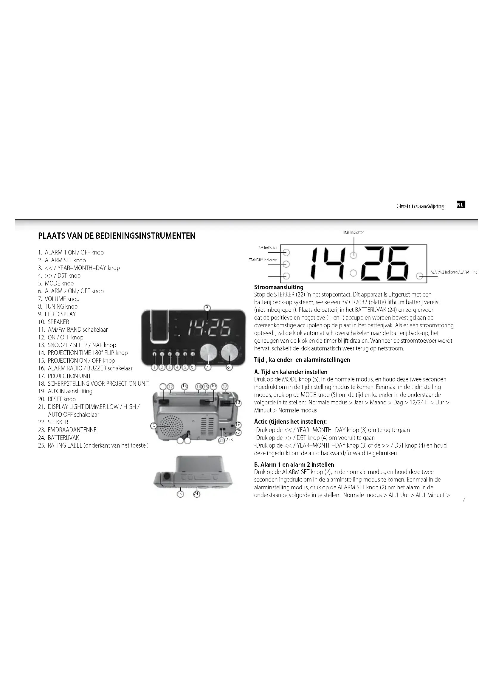- Zorg ervoor dat de FM DRAADANTENNE (23) helemaal uitgerold is, voor het verkrijgen van de beste FM-ontvangst. Aux in aansluiting De AUX IN aansluiting (19) kan worden gebruikt om alternatieve audio signalen af te spelen via de speakers van het apparaat. Deze AUX IN aansluiting (19) vereist een 3.5mm audiokabel (3.5mm audiokabel is niet inbegrepen). SPECIFICATIES Frequentiebereik: AM 530 – 1600 kHz / FM 88 – 108 MHz Batterij back-up: 1 x CR2032 (platte) lithium batterij Voeding: AC 230V - 50 Hz, 5 Watt Reset De RESET knop (20) is terug te vinden aan de achterkant van het apparaat. Gebruik een balpen om de RESET knop (20) in te drukken wanneer de batterijen worden vervangen of wanneer het apparaat niet naar behoren functioneert. Alle instellingen worden teruggezet naar de standaardwaarden, alle opgeslagen gegevens (alarm- en klokinstellingen) gaan verloren. Projection unit