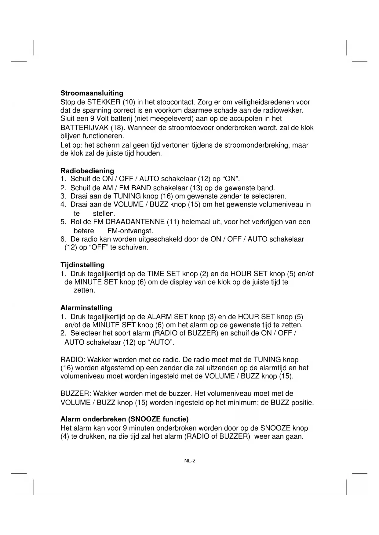 AUTO schakelaar (12) op “AUTO”. RADIO: Wakker worden met de radio. De radio moet met de TUNING knop (16) worden afgestemd op een zender die zal uitzenden op de alarmtijd en het volumeniveau moet worden ingesteld met de VOLUME / BUZZ knop (15). BUZZER: Wakker worden met de buzzer. Het volumeniveau moet met de VOLUME / BUZZ knop (15) worden ingesteld op het minimum; de BUZZ positie. Alarm onderbreken (SNOOZE functie) Het alarm kan voor 9 minuten onderbroken worden door op de SNOOZE knop (4) te drukken, na die tijd zal het alarm (RADIO of BUZZER) weer aan gaan.NL-3 Alarm uitzetten Om het alarm uit te zetten, druk op de ALARM OFF knop (1) en de alarmtijd zal worden gereset voor de volgende dag. Schuif de ON / OFF / AUTO schakelaar (12) op “OFF” om het alarm uit te zetten en niet in te stellen voor de volgende dag. SLEEP functie