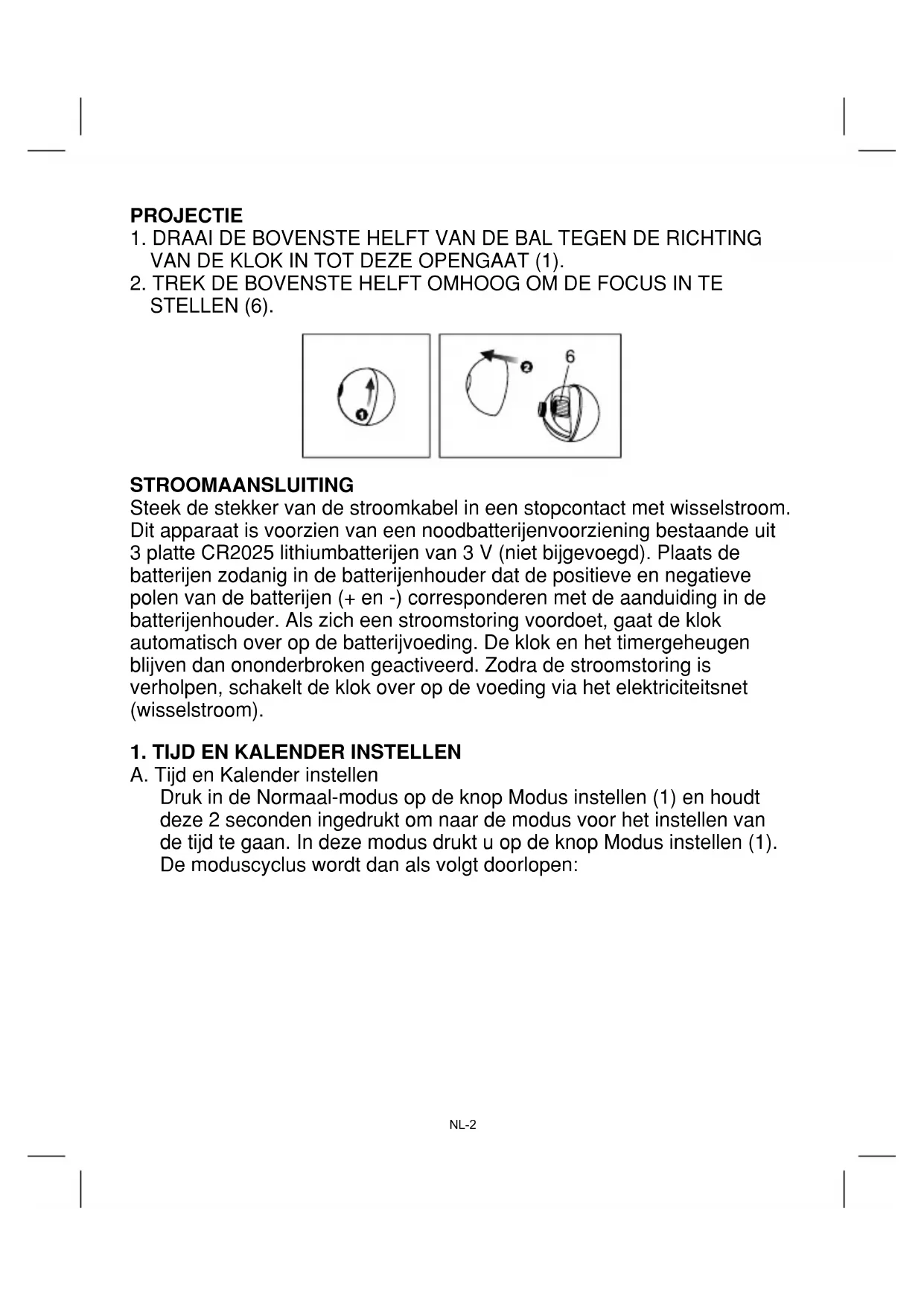 A. Tijd en Kalender instellen Druk in de Normaal-modus op de knop Modus instellen (1) en houdt deze 2 seconden ingedrukt om naar de modus voor het instellen van de tijd te gaan. In deze modus drukt u op de knop Modus instellen (1). De moduscyclus wordt dan als volgt doorlopen: PROJECTIE