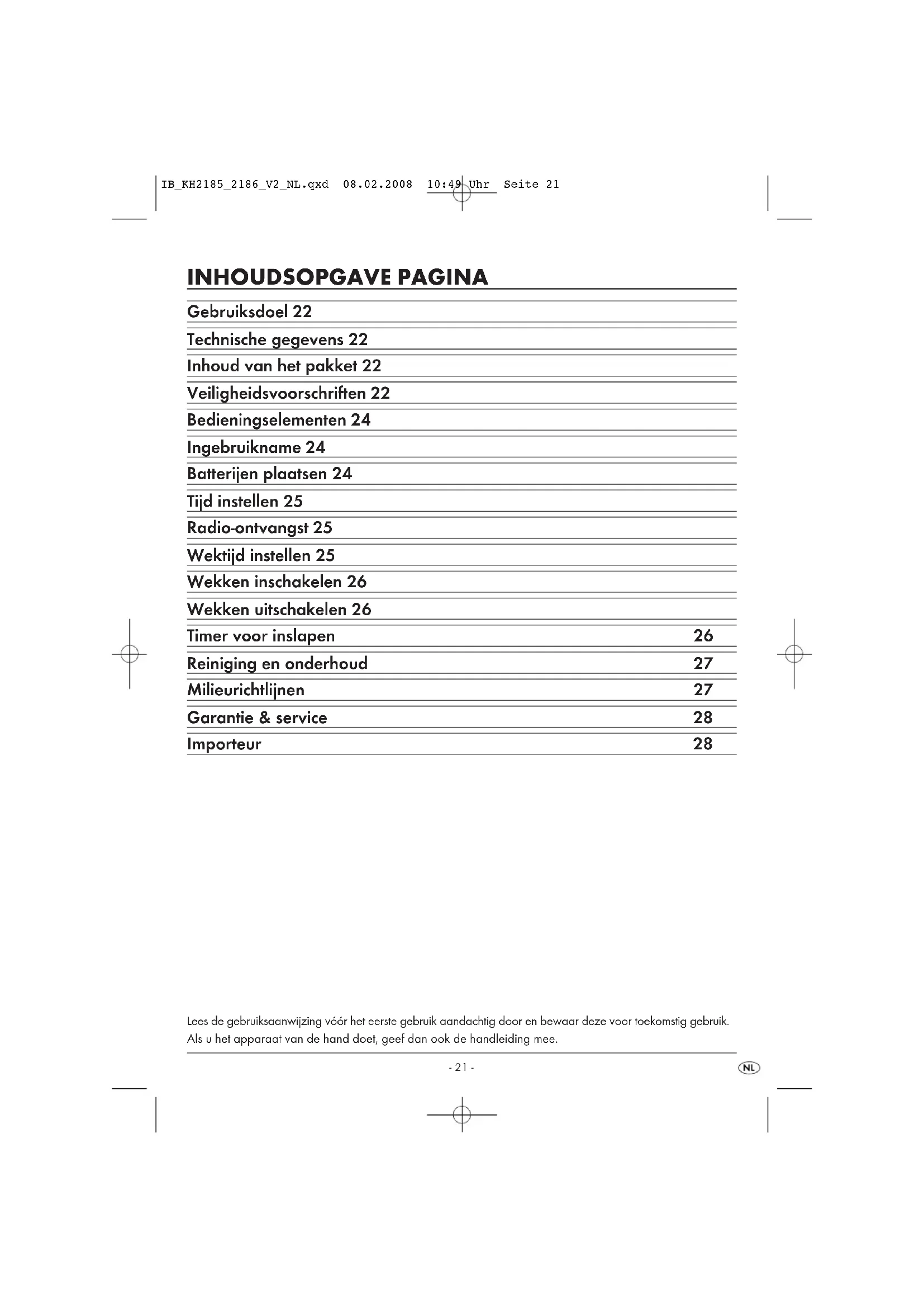 Garantie Kompernaß Service Deutschland Tel.: +49 (0) 180 5 008107 (14 Ct/Min. aus dem dt. Festnetz,ggf. abweichende Preise aus dem Mobilfunk) Fax: +49 (0) 2832 3532 e-mail: support.de@kompernass.com Afin de garantir la gratuité de la réparation, veuillez prendre contact avec la hotline du service après-vente. Préparez à cet effet votre ticket de caisse. Radio-réveil KH 2185 / KH 2186 IB_KH2185_2186_V2_FR.qxd 08.02.2008 10:49 Uhr Seite 19IB_KH2185_2186_V2_FR.qxd 08.02.2008 10:49 Uhr Seite 20- 21 - INHOUDSOPGAVE PAGINA Gebruiksdoel 22 Technische gegevens 22 Inhoud van het pakket 22 Veiligheidsvoorschriften 22 Bedieningselementen 24 Ingebruikname 24 Batterijen plaatsen 24 Tijd instellen 25 Radio-ontvangst 25 Wektijd instellen 25 Wekken inschakelen 26 Wekken uitschakelen 26 Timer voor inslapen 26 Reiniging en onderhoud 27 Milieurichtlijnen 27 Garantie & service 28 Importeur 28 Lees de gebruiksaanwijzing vóór het eerste gebruik aandachtig door en bewaar deze voor toekomstig gebruik. Als u het apparaat van de hand doet, geef dan ook de handleiding mee. IB_KH2185_2186_V2_NL.qxd 08.02.2008 10:49 Uhr Seite 21- 22 - RADIOWEKKER KH 2185/KH 2186 Gebruiksdoel Dit toestel is bedoeld om FM / AM radiozenders te ontvangen, alsook om met een geluidssignaal of met het geluid van de radio iemand te wekken. Dit toestel is uitsluitend bedoeld voor huishoudelijk ge- bruik. Het is niet geschikt voor commercieel of in- dustrieel gebruik. Technische gegevens Netspanning: 230 - 240 V