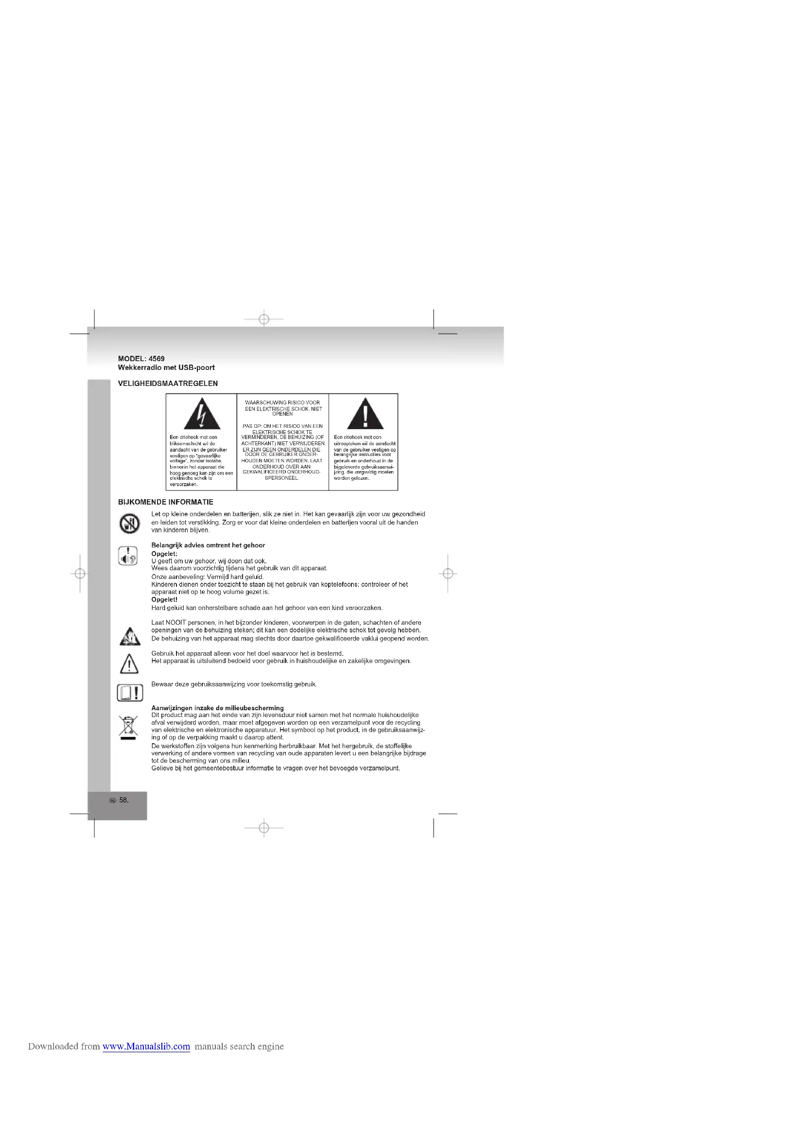 Downloaded from www.Manualslib.com manuals search engine58. MODEL: 4569 Wekkerradio met USB-poort VELIGHEIDSMAATREGELEN Een driehoek met een uitroepteken wil de aandacht van de gebruiker vestigen op belangrijke instructies voor gebruik en onderhoud in de bijgeleverde gebruiksaanwi-jzing, die zorgvuldig moeten worden gelezen.Een driehoek met een bliksemschicht wil de aandacht van de gebruiker vestigen op “gevaarlijke voltage”, zonder isolatie, binnenin het apparaat die hoog genoeg kan zijn om een elektrische schok te veroorzaken.Let op kleine onderdelen en batterijen, slik ze niet in. Het kan gevaarlijk zijn voor uw gezondheid en leiden tot verstikking. Zorg er voor dat kleine onderdelen en batterijen vooral uit de handen van kinderen blijven.Belangrijk advies omtrent het gehoorOpgelet:U geeft om uw gehoor, wij doen dat ook.Wees daarom voorzichtig tijdens het gebruik van dit apparaat.Onze aanbeveling: Vermijd hard geluid.Kinderen dienen onder toezicht te staan bij het gebruik van koptelefoons; controleer of het apparaat niet op te hoog volume gezet is.Opgelet!Hard geluid kan onherstelbare schade aan het gehoor van een kind veroorzaken.Laat NOOIT personen, in het bijzonder kinderen, voorwerpen in de gaten, schachten of andere openingen van de behuizing steken; dit kan een dodelijke elektrische schok tot gevolg hebben. De behuizing van het apparaat mag slechts door daartoe gekwalificeerde vaklui geopend worden.Gebruik het apparaat alleen voor het doel waarvoor het is bestemd.Het apparaat is uitsluitend bedoeld voor gebruik in huishoudelijke en zakelijke omgevingen.Bewaar deze gebruiksaanwijzing voor toekomstig gebruik.Aanwijzingen inzake de milieubeschermingDit product mag aan het einde van zijn levensduur niet samen met het normale huishoudelijke afval verwijderd worden, maar moet afgegeven worden op een verzamelpunt voor de recycling van elektrische en elektronische apparatuur. Het symbool op het product, in de gebruiksaanwijz ing of op de verpakking maakt u daarop attent. De werkstoffen zijn volgens hun kenmerking herbruikbaar. Met het hergebruik, de stoffelijke verwerking of andere vormen van recycling van oude apparaten levert u een belangrijke bijdrage tot de bescherming van ons milieu.Gelieve bij het gemeentebestuur informatie te vragen over het bevoegde verzamelpunt. BIJKOMENDE INFORMATIE WAARSCHUWING RISICO VOOR EEN ELEKTRISCHE SCHOK, NIET OPENENPAS OP: OM HET RISICO VAN EEN ELEKTRISCHE SCHOK TE VERMINDEREN, DE BEHUIZING (OF ACHTERKANT) NIET VERWIJDEREN. ER ZIJN GEEN ONDERDELEN DIE DOOR DE GEBRUIKER ONDER-HOUDEN MOETEN WORDEN. LAAT ONDERHOUD OVER AAN GEKWALIFICEERD ONDERHOUD-SPERSONEEL. Downloaded from www.Manualslib.com manuals search engine59. Verhinder nooit de ventilatie van het apparaat door middel van gordijnen, kranten, dekens of meubelstukken. De ventilatiegaten moeten altijd vrij zijn. Oververhitting kan schade veroorzaken en de levensduur van het apparaat verkorten.Hitte en warmteStel het apparaat niet bloot aan direct zonlicht. Zorg ervoor dat het apparaat niet wordt blootgesteld aan directe hittebronnen zoals verwarmingen en open vuur.Zorg ervoor dat de ventilatiegaten niet zijn bedekt.Vocht en reinigingDit apparaat is niet waterbestendig! Dompel het apparaat niet onder in water. Laat het apparaat niet in contact komen met water. Als er water in het apparaat komt, dan kan dat ernstige schade veroorzaken. Gebruik geen schoonmaakmiddelen die alcohol, ammoniak, benzine of schuurmiddelen bevatten omdat deze het apparaat kunnen beschadigen. Gebruik voor het schoonmaken een zachte vochtige doek.Professionele recyclingBatterijen en verpakking horen niet thuis in het huisafval. De batterijen moeten worden ingeleverd bij een verzamelpunt voor gebruikte batterijen. Verpakkingsmateriaal gescheiden deponeren is goed voor het milieu. VELIGHEIDSMAATREGELEN