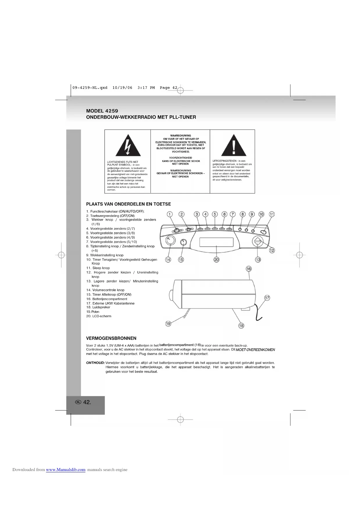knop 14. Volumecontrole knop15. Timer Aftelknop (OFF/ON)16. Batterijencompartiment17. Externe UKW Kabelantenne18. Luidspreker19. Poten20. LCD-scherm VERMOGENSBRONNEN Voer 2 stuks 1,5V (UM-4 x AAA) batterijen in het bbaatttteerriijjeennccoommppaarrttiimmeenntt ((1166)) in voor een eventuele back-up.Controleer, voor u de AC stekker in het stopcontact steekt, het voltage dat op het apparaat staan. Dit MMOOEETT OOVVEERREEEENNKKOOMMEENN met het voltage in het stopcontact. Plug daarna de AC stekker in het stopcontact. ONTHOUD: Verwijder de batterijen altijd uit het batterijencompartiment als het apparaat lange tijd niet gebruikt gaat worden. Hiermee voorkomt u batterijlekkage, die het apparaat beschadigt. Het is aangeraden alkalinebatterijen te gebruiken voor het beste resultaat.