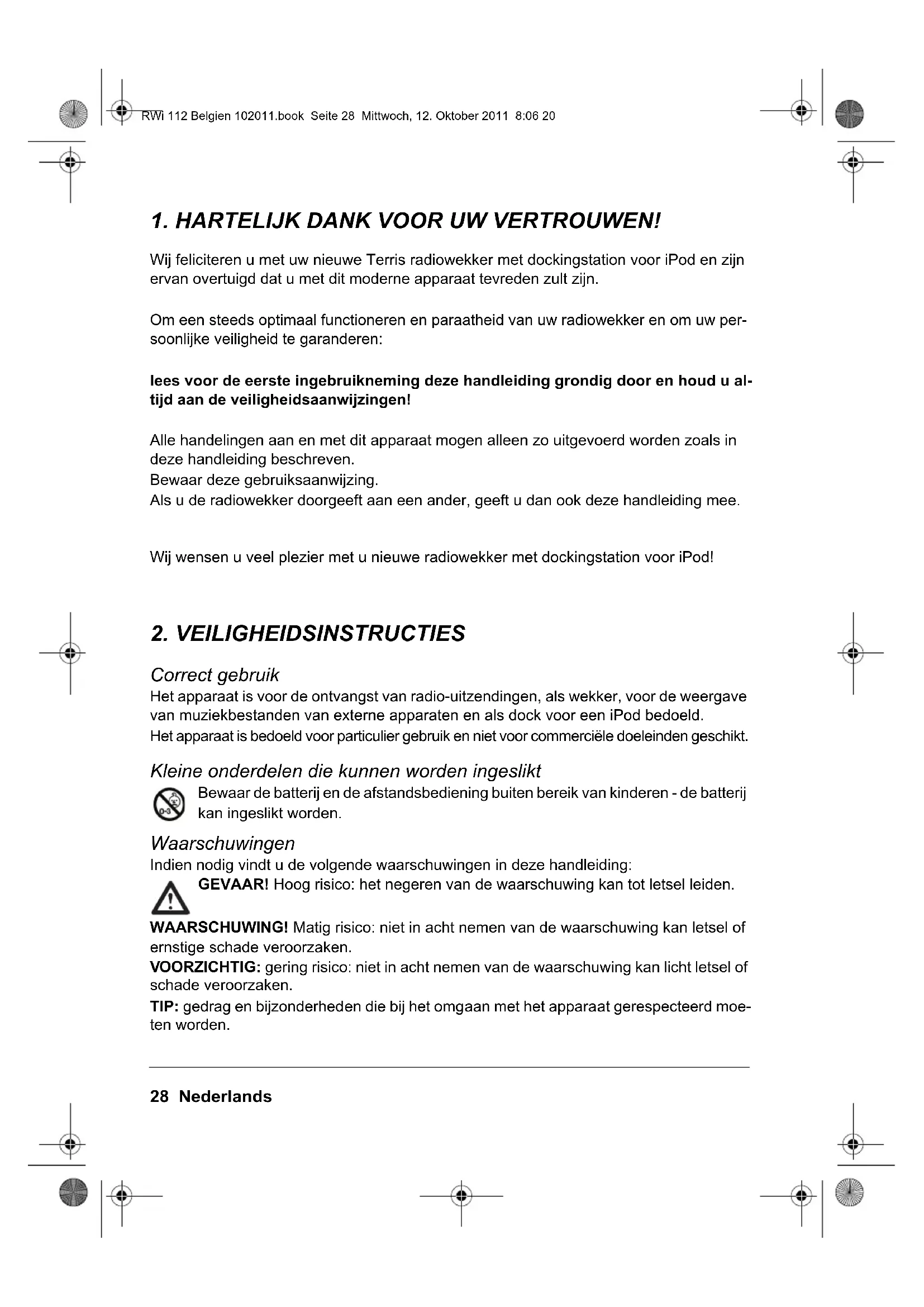 Wij feliciteren u met uw nieuwe Terris radiowekker met dockingstation voor iPod en zijn ervan overtuigd dat u met dit moderne apparaat tevreden zult zijn. Om een steeds optimaal functioneren en paraatheid van uw radiowekker en om uw per- soonlijke veiligheid te garanderen: lees voor de eerste ingebruikneming deze handleiding grondig door en houd u al- tijd aan de veiligheidsaanwijzingen! Alle handelingen aan en met dit apparaat mogen alleen zo uitgevoerd worden zoals in deze handleiding beschreven. Bewaar deze gebruiksaanwijzing. Als u de radiowekker doorgeeft aan een ander, geeft u dan ook deze handleiding mee. Wij wensen u veel plezier met u nieuwe radiowekker met dockingstation voor iPod!