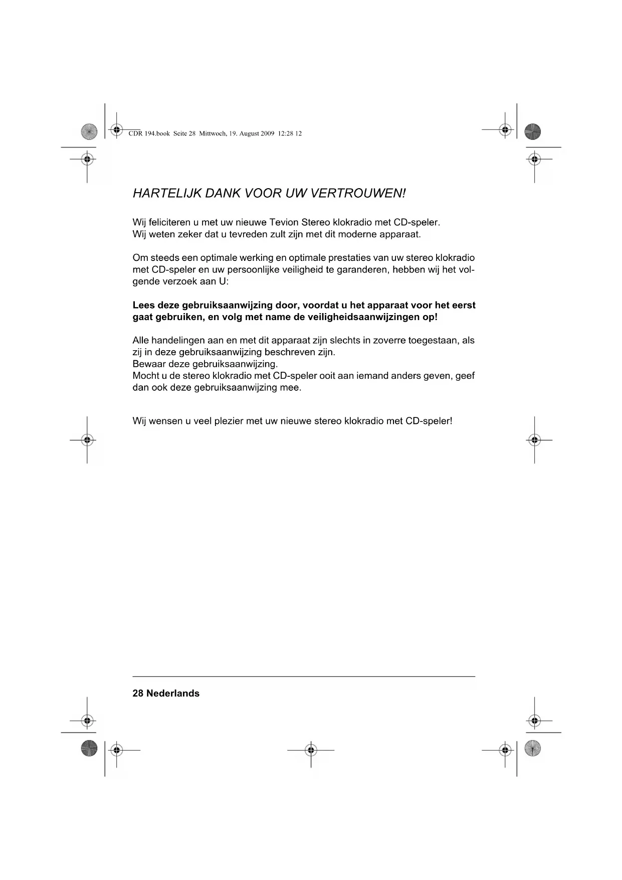 CDR 194.book Seite 27 Mittwoch, 19. August 2009 12:28 1228 Nederlands HARTELIJK DANK VOOR UW VERTROUWEN! Wij feliciteren u met uw nieuwe Tevion Stereo klokradio met CD-speler. Wij weten zeker dat u tevreden zult zijn met dit moderne apparaat. Om steeds een optimale werking en optimale prestaties van uw stereo klokradio met CD-speler en uw persoonlijke veiligheid te garanderen, hebben wij het vol- gende verzoek aan U: Lees deze gebruiksaanwijzing door, voordat u het apparaat voor het eerst gaat gebruiken, en volg met name de veiligheidsaanwijzingen op! Alle handelingen aan en met dit apparaat zijn slechts in zoverre toegestaan, als zij in deze gebruiksaanwijzing beschreven zijn. Bewaar deze gebruiksaanwijzing. Mocht u de stereo klokradio met CD-speler ooit aan iemand anders geven, geef dan ook deze gebruiksaanwijzing mee. Wij wensen u veel plezier met uw nieuwe stereo klokradio met CD-speler! CDR 194.book Seite 28 Mittwoch, 19. August 2009 12:28 12Nederlands 29