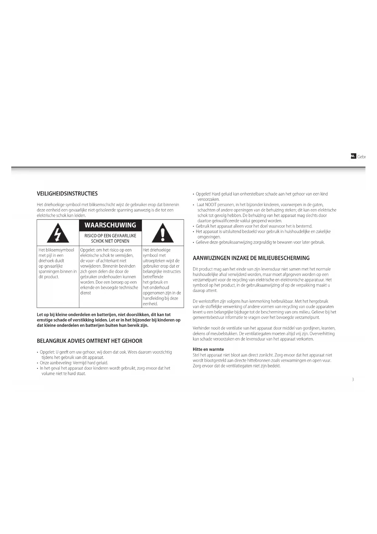 Gebruiksaanwijzing VEILIGHEIDSINSTRUCTIES Het driehoekige symbool met bliksemschicht wijst de gebruiker erop dat binnenin deze eenheid een gevaarlijke niet geïsoleerde spanning aanwezig is die tot een elektrische schok kan leiden. WAARSCHUWING RISICO Op een gevaaRlIjke SCHOk nIeT Openen Het bliksemsymbool met pijl in een driehoek duidt op gevaarlijke spanningen binnen in dit product. Opgelet: om het risico op een elektrische schok te vermijden, de voor- of achterkant niet verwijderen. Binnenin bevinden zich geen delen die door de gebruiker onderhouden kunnen worden. Doe een beroep op een erkende en bevoegde technische dienst Het driehoekige symbool met uitroepteken wijst de gebruiker erop dat er belangrijke instructies betreffende het gebruik en het onderhoud opgenomen zijn in de handleiding bij deze eenheid. Let op bij kleine onderdelen en batterijen, niet doorslikken, dit kan tot ernstige schade of verstikking leiden. Let er in het bijzonder bij kinderen op dat kleine onderdelen en batterijen buiten hun bereik zijn.