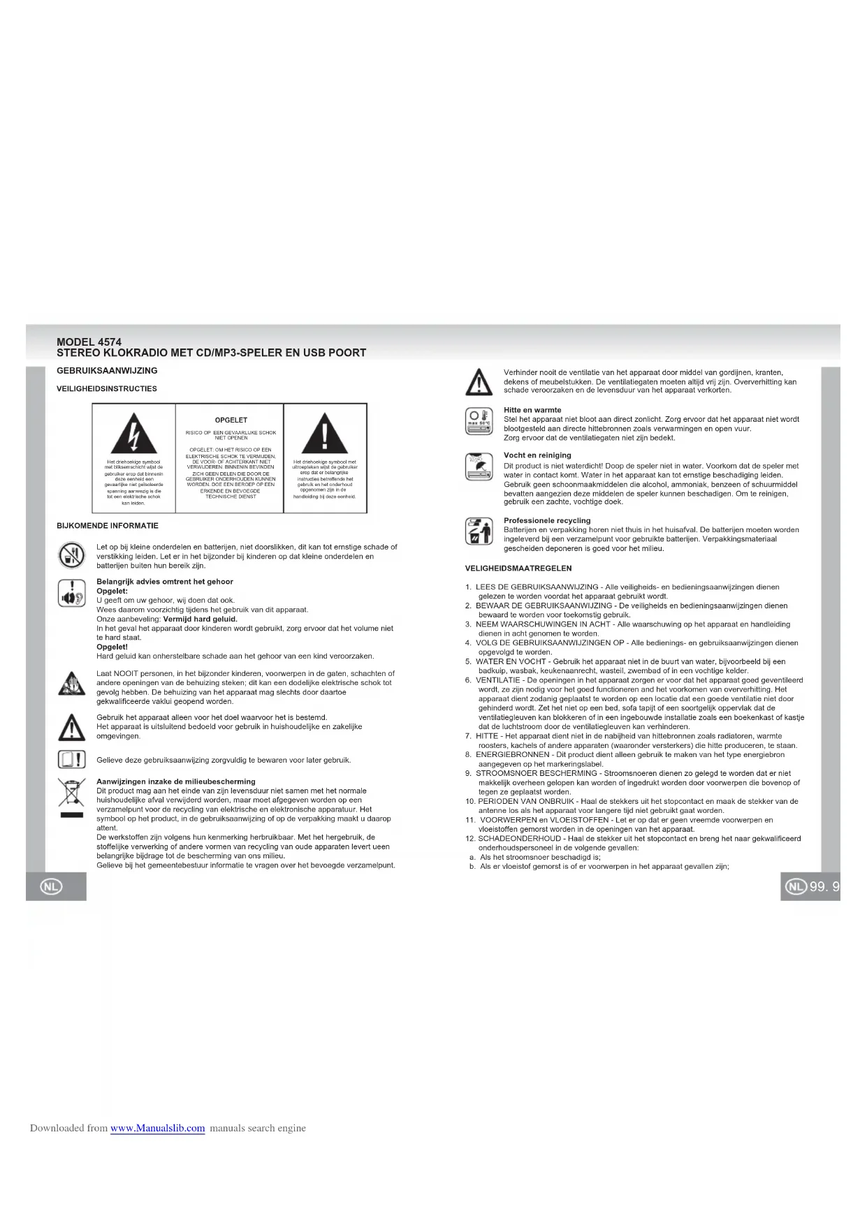 POPRAWNIE NIEPOPRAWNIE Downloaded from www.Manualslib.com manuals search engine99. 98. Het driehoekige symbool met bliksemschicht wijst de gebruiker erop dat binnenin deze eenheid een gevaarlijke niet geïsoleerde spanning aanwezig is die tot een elektrische schok kan leiden.Het driehoekige symbool met uitroepteken wijst de gebruiker erop dat er belangrijke instructies betreffende het gebruik en het onderhoud opgenomen zijn in de handleiding bij deze eenheid.OPGELETRISICO OP EEN GEVAARLIJKE SCHOKNIET OPENEN OPGELET: OM HET RISICO OP EEN ELEKTRISCHE SCHOK TE VERMIJDEN, DE VOOR- OF ACHTERKANT NIET VERWIJDEREN. BINNENIN BEVINDEN ZICH GEEN DELEN DIE DOOR DE GEBRUIKER ONDERHOUDEN KUNNEN WORDEN. DOE EEN BEROEP OP EEN ERKENDE EN BEVOEGDE TECHNISCHE DIENST MODEL 4574 STEREO KLOKRADIO MET CD/MP3-SPELER EN USB POORT Gebruik het apparaat alleen voor het doel waarvoor het is bestemd.Het apparaat is uitsluitend bedoeld voor gebruik in huishoudelijke en zakelijke omgevingen.Gelieve deze gebruiksaanwijzing zorgvuldig te bewaren voor later gebruik.Aanwijzingen inzake de milieubeschermingDit product mag aan het einde van zijn levensduur niet samen met het normale huishoudelijke afval verwijderd worden, maar moet afgegeven worden op een verzamelpunt voor de recycling van elektrische en elektronische apparatuur. Het symbool op het product, in de gebruiksaanwijzing of op de verpakking maakt u daarop attent.De werkstoffen zijn volgens hun kenmerking herbruikbaar. Met het hergebruik, de stoffelijke verwerking of andere vormen van recycling van oude apparaten levert ueen belangrijke bijdrage tot de bescherming van ons milieu.Gelieve bij het gemeentebestuur informatie te vragen over het bevoegde verzamelpunt.Laat NOOIT personen, in het bijzonder kinderen, voorwerpen in de gaten, schachten of andere openingen van de behuizing steken; dit kan een dodelijke elektrische schok tot gevolg hebben. De behuizing van het apparaat mag slechts door daartoe gekwalificeerde vaklui geopend worden.Let op bij kleine onderdelen en batterijen, niet doorslikken, dit kan tot ernstige schade of verstikking leiden. Let er in het bijzonder bij kinderen op dat kleine onderdelen en batterijen buiten hun bereik zijn.Belangrijk advies omtrent het gehoorOpgelet:U geeft om uw gehoor, wij doen dat ook.Wees daarom voorzichtig tijdens het gebruik van dit apparaat.Onze aanbeveling: Vermijd hard geluid.In het geval het apparaat door kinderen wordt gebruikt, zorg ervoor dat het volume niet te hard staat.Opgelet!Hard geluid kan onherstelbare schade aan het gehoor van een kind veroorzaken.GEBRUIKSAANWIJZINGVEILIGHEIDSINSTRUCTIESBIJKOMENDE INFORMATIEVELIGHEIDSMAATREGELEN1. LEES DE GEBRUIKSAANWIJZING - Alle veiligheids- en bedieningsaanwijzingen dienen gelezen te worden voordat het apparaat gebruikt wordt.2. BEWAAR DE GEBRUIKSAANWIJZING - De veiligheids en bedieningsaanwijzingen dienen bewaard te worden voor toekomstig gebruik.3. NEEM WAARSCHUWINGEN IN ACHT - Alle waarschuwing op het apparaat en handleiding dienen in acht genomen te worden.4. VOLG DE GEBRUIKSAANWIJZINGEN OP - Alle bedienings- en gebruiksaanwijzingen dienen opgevolgd te worden. 5. WATER EN VOCHT - Gebruik het apparaat niet in de buurt van water, bijvoorbeeld bij een badkuip, wasbak, keukenaanrecht, wasteil, zwembad of in een vochtige kelder.6. VENTILATIE - De openingen in het apparaat zorgen er voor dat het apparaat goed geventileerd wordt, ze zijn nodig voor het goed functioneren and het voorkomen van oververhitting. Het apparaat dient zodanig geplaatst te worden op een locatie dat een goede ventilatie niet door gehinderd wordt. Zet het niet op een bed, sofa tapijt of een soortgelijk oppervlak dat de ventilatiegleuven kan blokkeren of in een ingebouwde installatie zoals een boekenkast of kastje dat de luchtstroom door de ventilatiegleuven kan verhinderen.7. HITTE - Het apparaat dient niet in de nabijheid van hittebronnen zoals radiatoren, warmte roosters, kachels of andere apparaten (waaronder versterkers) die hitte produceren, te staan. 8. ENERGIEBRONNEN - Dit product dient alleen gebruik te maken van het type energiebron aangegeven op het markeringslabel.9. STROOMSNOER BESCHERMING - Stroomsnoeren dienen zo gelegd te worden dat er niet makkelijk overheen gelopen kan worden of ingedrukt worden door voorwerpen die bovenop of tegen ze geplaatst worden.10. PERIODEN VAN ONBRUIK - Haal de stekkers uit het stopcontact en maak de stekker van de antenne los als het apparaat voor langere tijd niet gebruikt gaat worden.11. VOORWERPEN en VLOEISTOFFEN - Let er op dat er geen vreemde voorwerpen en vloeistoffen gemorst worden in de openingen van het apparaat. 12. SCHADEONDERHOUD - Haal de stekker uit het stopcontact en breng het naar gekwalificeerd onderhoudspersoneel in de volgende gevallen: a. Als het stroomsnoer beschadigd is; b. Als er vloeistof gemorst is of er voorwerpen in het apparaat gevallen zijn;Verhinder nooit de ventilatie van het apparaat door middel van gordijnen, kranten, dekens of meubelstukken. De ventilatiegaten moeten altijd vrij zijn. Oververhitting kan schade veroorzaken en de levensduur van het apparaat verkorten.Hitte en warmteStel het apparaat niet bloot aan direct zonlicht. Zorg ervoor dat het apparaat niet wordt blootgesteld aan directe hittebronnen zoals verwarmingen en open vuur.Zorg ervoor dat de ventilatiegaten niet zijn bedekt.Vocht en reinigingDit product is niet waterdicht! Doop de speler niet in water. Voorkom dat de speler met water in contact komt. Water in het apparaat kan tot ernstige beschadiging leiden. Gebruik geen schoonmaakmiddelen die alcohol, ammoniak, benzeen of schuurmiddel bevatten aangezien deze middelen de speler kunnen beschadigen. Om te reinigen, gebruik een zachte, vochtige doek.Professionele recyclingBatterijen en verpakking horen niet thuis in het huisafval. De batterijen moeten worden ingeleverd bij een verzamelpunt voor gebruikte batterijen. Verpakkingsmateriaal gescheiden deponeren is goed voor het milieu. Downloaded from www.Manualslib.co