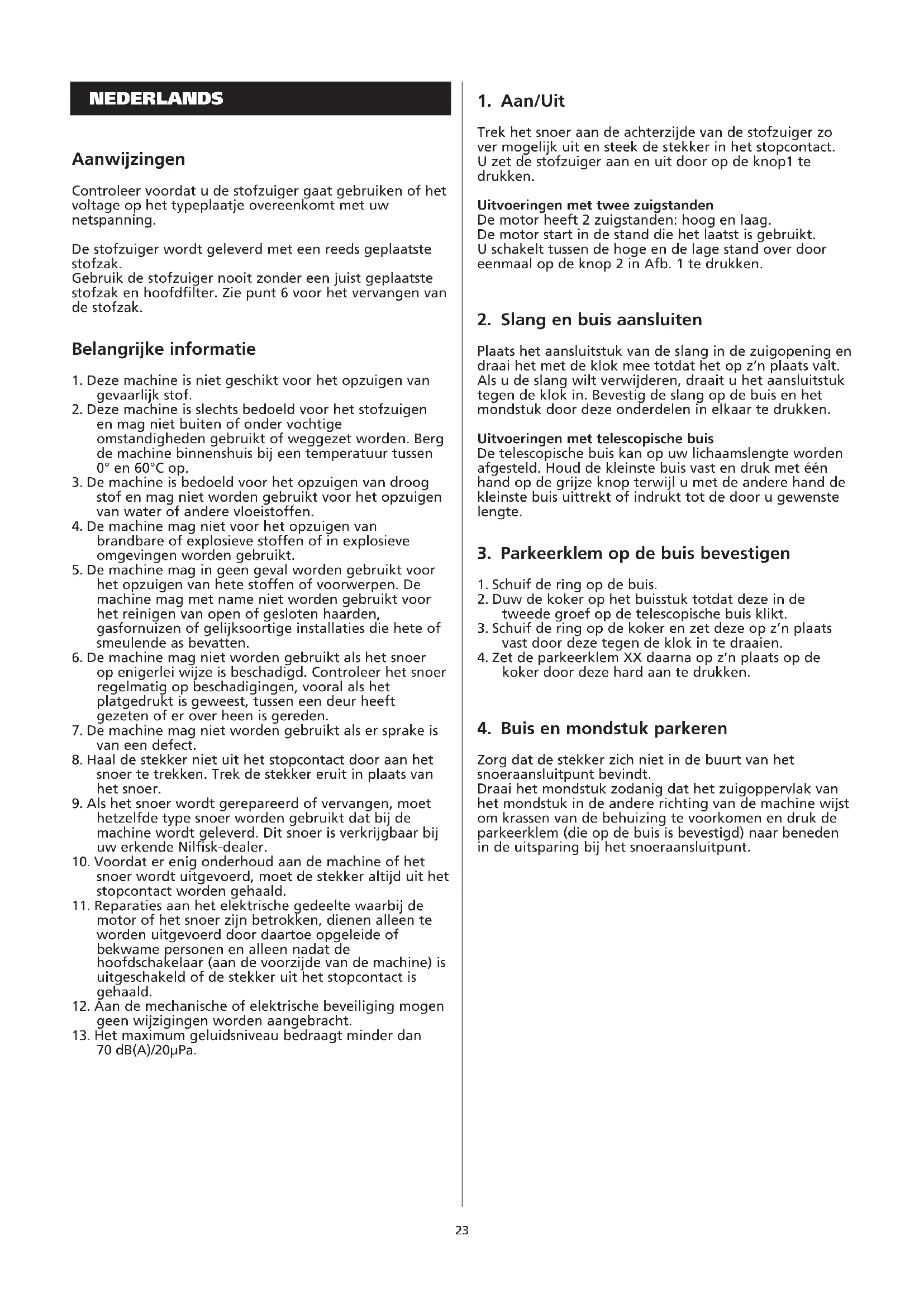 - als de stofzuiger stopt – de thermische zekering heeft de motor uitgeschakeld ten gevolge van een verstopping in de slang, de buis of het mondstuk. Verwijder de oorzaak van de verstopping. De stofzuiger zal dan al weer gauw opnieuw starten. Onderhoud Zet de stofzuiger op een droge plek weg. De stofzuiger hoeft niet te worden doorgesmeerd enz. De stofzuiger is speciaal ontworpen voor langdurige en veeleisende werkzaamheden, maar, afhankelijk van de mate van gebruik, moeten de stoffilters op een gegeven moment worden vervangen. Reinig de buitenkant van de stofzuiger met een droog doekje, met eventueel een beetje sulfon. Neem voor eventuele reparaties contact op met uw plaatselijke dealer.26 Instrucciones Antes de utilizar el aspirador asegúrese de que el voltaje que aparece en la placa coincide con el del suministro eléctrico. El aspirador se suministra con la bolsa de recogida de polvo instalada. No utilice nunca el aspirador sin una bolsa adecuadamente instalada, ni tampoco sin el filtro principal. En el punto 6 se describe el modo de cambiar la bolsa de recogida del polvo. Información