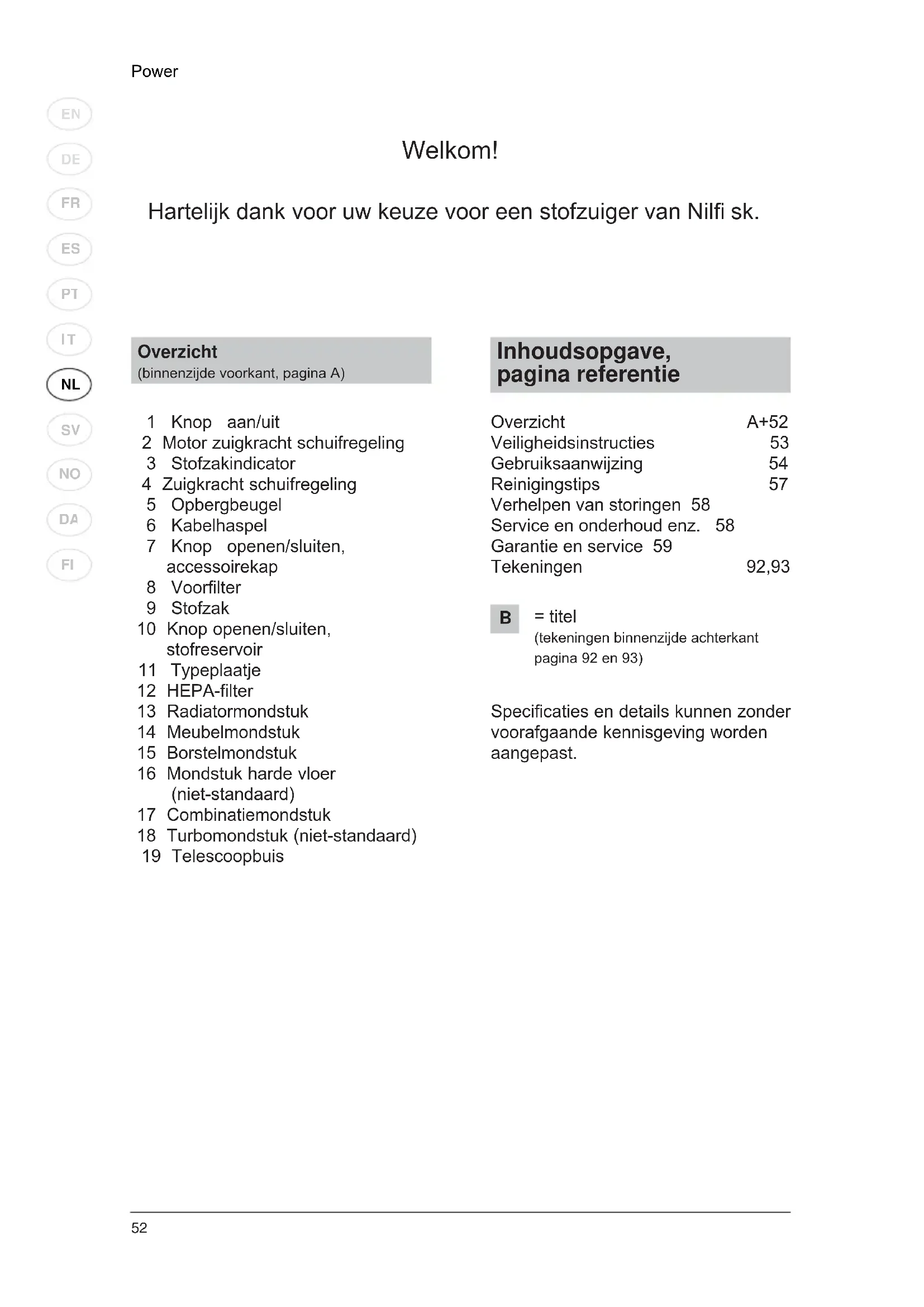 Inhoudsopgave, pagina referentie Overzicht A+52 Veiligheidsinstructies 53 Gebruiksaanwijzing 54 Reinigingstips 57 Verhelpen van storingen 58 Service en onderhoud enz. 58 Garantie en service 59 Tekeningen 92,93 Specificaties en details kunnen zonder voorafgaande kennisgeving worden aangepast. Overzicht (binnenzijde voorkant, pagina A) 1 Knop aan/uit 2 Motor zuigkracht schuifregeling 3 Stofzakindicator 4 Zuigkracht schuifregeling 5 Opbergbeugel 6 Kabelhaspel 7 Knop openen/sluiten, accessoirekap 8 Voorfilter 9 Stofzak 10 Knop openen/sluiten, stofreservoir 11 Typeplaatje 12 HEPA-filter 13 Radiatormondstuk 14 Meubelmondstuk 15 Borstelmondstuk 16 Mondstuk harde vloer (niet-standaard) 17 Combinatiemondstuk 18 Turbomondstuk (niet-standaard) 19 Telescoopbuis Welkom! Hartelijk dank voor uw keuze voor een stofzuiger van Nilfi sk.