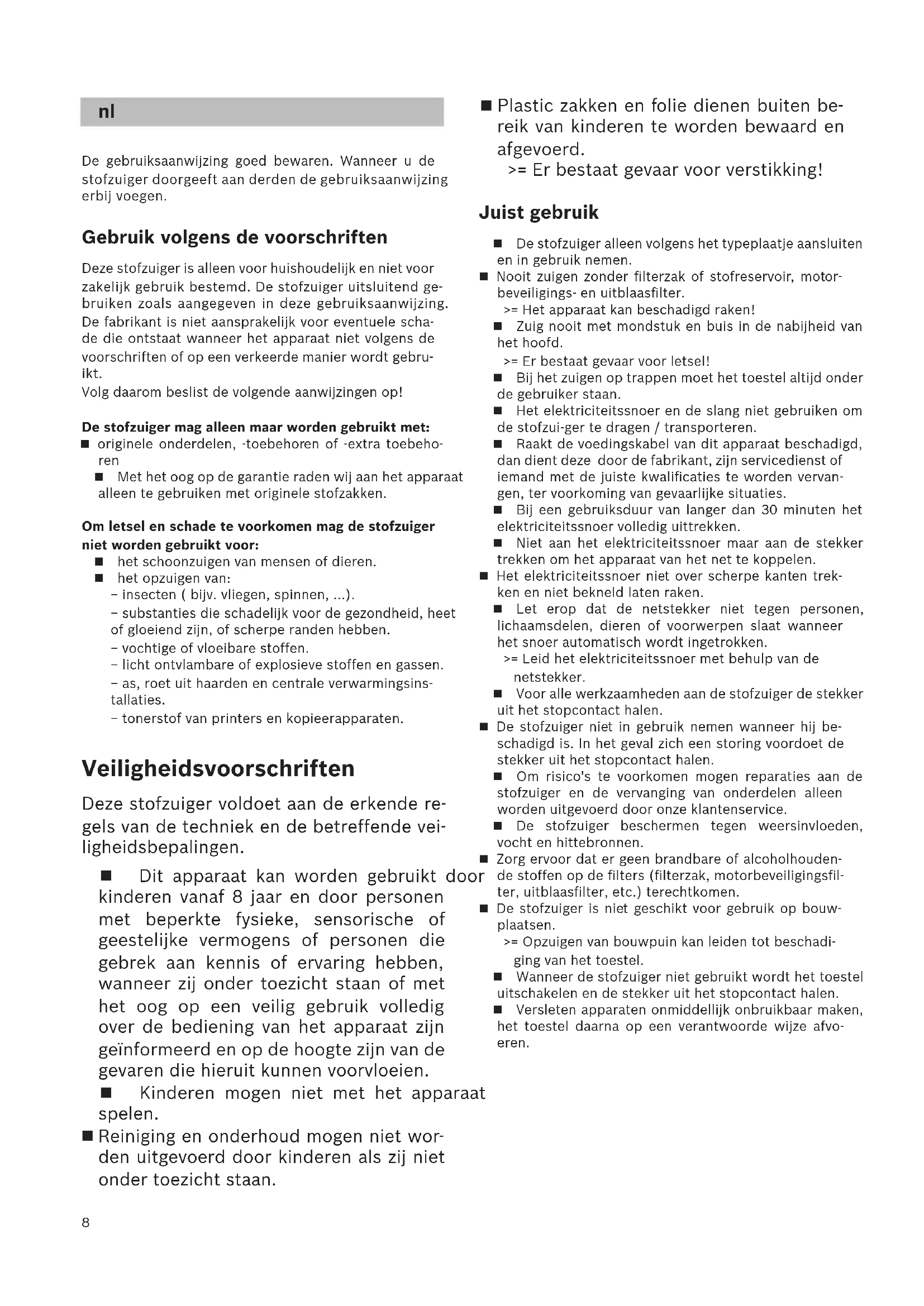 Achterklep sluiten. Na het opzuigen van fijne stofdeeltjes (zoals gips, ce- ment, etc), de motorbeveiligingsfilter schoonmaken door hem uit te kloppen, zo nodig de motorbeveili- gingsfilter en de uitblaasfilter vervangen. Schoonmaken Voor gebruik dient de stofzuiger altijd uitgeschakeld en de stekker uit het stopcontact te worden gehaald. Stofzuigers en accessoires van kunststof kunnen wor- den onderhouden met een in de handel gebruikelijk schoonmaakmiddel voor kunststof.