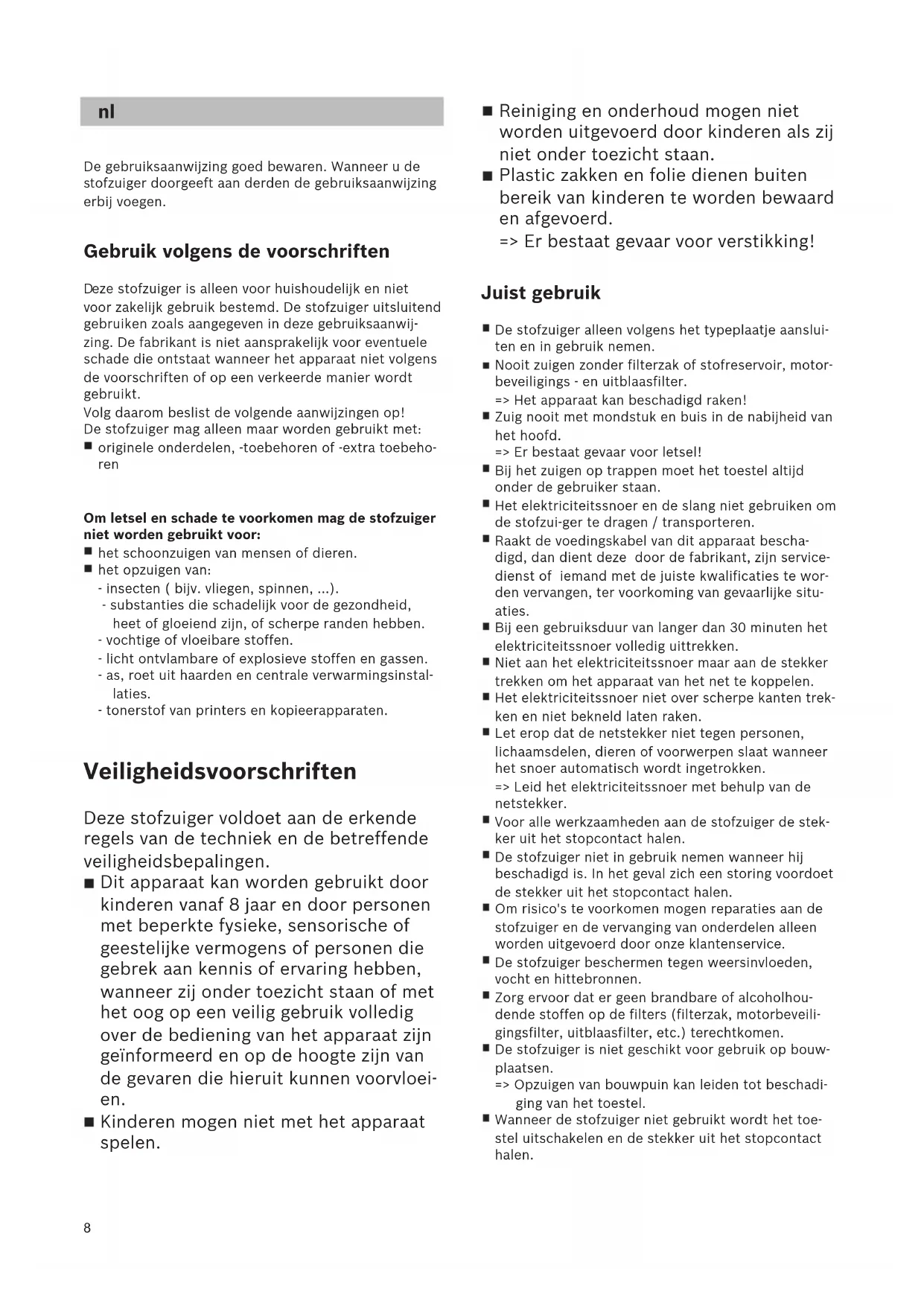 oor zakelijk gebruik bestemd. De stofzuiger uitsluitend gebruiken zoals aangegeven in deze gebruiksaanwij- zing. De fabrikant is niet aansprakelijk voor eventuele schade die ontstaat wanneer het apparaat niet volgens de voorschriften of op een verkeerde manier wordt gebruikt. Volg daarom beslist de volgende aanwijzingen op! De stofzuiger mag alleen maar worden gebruikt met: originele onderdelen, -toebehoren of -extra toebeho- ren Om letsel en schade te voorkomen mag de stofzuiger niet worden gebruikt voor: het schoonzuigen van mensen of dieren. het opzuigen van: - insecten ( bijv. vliegen, spinnen, ...). - substanties die schadelijk voor de gezondheid, heet of gloeiend zijn, of scherpe randen hebben. - vochtige of vloeibare stoffen. - licht ontvlambare of explosieve stoffen en gassen. - as, roet uit haarden en centrale verwarmingsinstal- laties. - tonerstof van printers en kopieerapparaten. Veiligheidsvoorschriften Deze stofzuiger voldoet aan de erkende regels van de techniek en de betreffende veiligheidsbepalingen. Dit apparaat kan worden gebruikt door kinderen vanaf 8 jaar en door personen met beperkte fysieke, sensorische of geestelijke vermogens of personen die gebrek aan kennis of ervaring hebben, wanneer zij onder toezicht staan of met het oog op een veilig gebruik volledig over de bediening van het apparaat zijn geïnformeerd en op de hoogte zijn van de gevaren die hieruit kunnen voorvloei- en. Kinderen mogen niet met het apparaat spelen.9