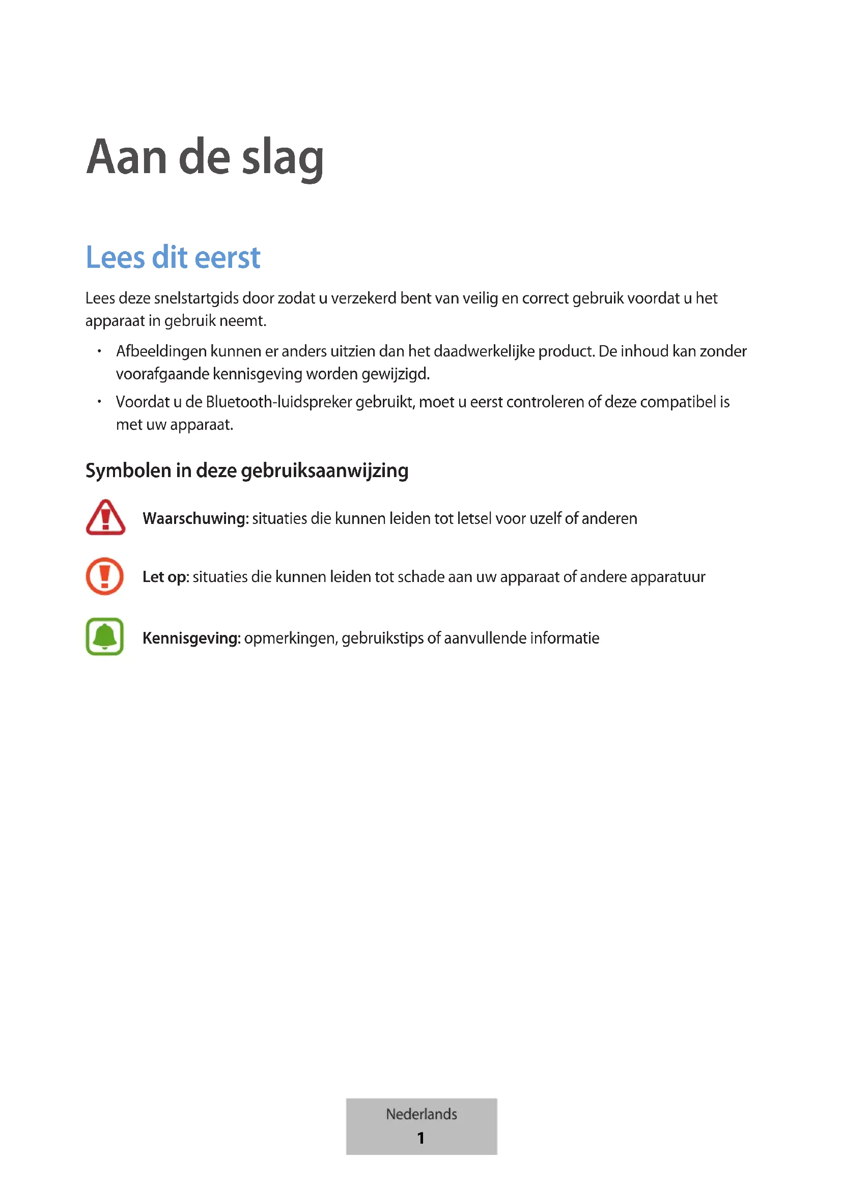 Voordat u de Bluetooth-luidspreker gebruikt, moet u eerst controleren of deze compatibel is met uw apparaat. Symbolen in deze gebruiksaanwijzing Waarschuwing: situaties die kunnen leiden tot letsel voor uzelf of anderen Let op: situaties die kunnen leiden tot schade aan uw apparaat of andere apparatuur Kennisgeving: opmerkingen, gebruikstips of aanvullende informatie Nederlands 1Aan de slag