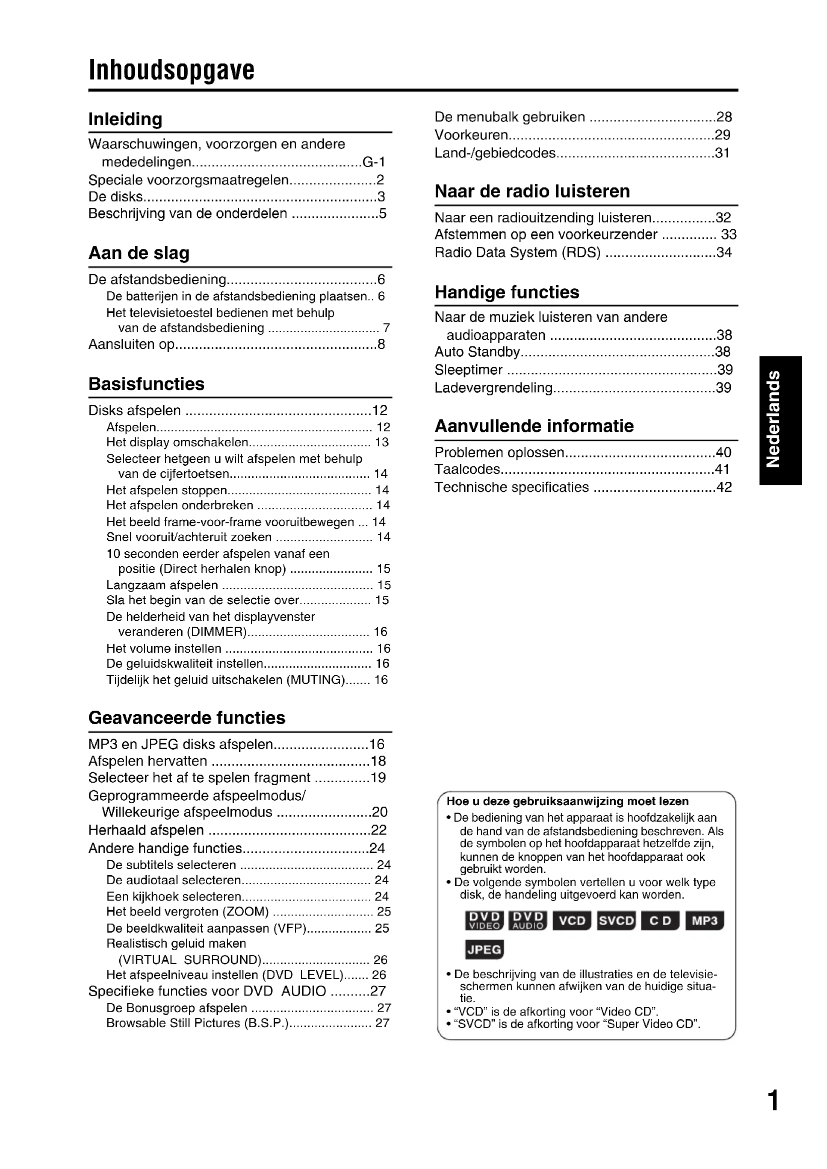 Spécifications EXA1mkII[E EN][FR]-specification.fm Page 42 Thursday, January 20, 2005 2:39 PM1 Nederlands Inleiding Waarschuwingen, voorzorgen en andere mededelingen...........................................G-1 Speciale voorzorgsmaatregelen......................2 De disks...........................................................3 Beschrijving van de onderdelen ......................5 Aan de slag De afstandsbediening......................................6 De batterijen in de afstandsbediening plaatsen.. 6 Het televisietoestel bedienen met behulp van de afstandsbediening ............................... 7 Aansluiten op...................................................8 Basisfuncties Disks afspelen ...............................................12 Afspelen............................................................ 12 Het display omschakelen.................................. 13 Selecteer hetgeen u wilt afspelen met behulp van de cijfertoetsen....................................... 14 Het afspelen stoppen........................................ 14 Het afspelen onderbreken ................................ 14 Het beeld frame-voor-frame vooruitbewegen ... 14 Snel vooruit/achteruit zoeken ........................... 14 10 seconden eerder afspelen vanaf een positie (Direct herhalen knop) ....................... 15 Langzaam afspelen .......................................... 15 Sla het begin van de selectie over.................... 15 De helderheid van het displayvenster veranderen (DIMMER).................................. 16 Het volume instellen ......................................... 16 De geluidskwaliteit instellen.............................. 16 Tijdelijk het geluid uitschakelen (MUTING)....... 16 Geavanceerde functies MP3 en JPEG disks afspelen........................16 Afspelen hervatten ........................................18 Selecteer het af te spelen fragment ..............19 Geprogrammeerde afspeelmodus/ Willekeurige afspeelmodus ........................20 Herhaald afspelen .........................................22 Andere handige functies................................24 De subtitels selecteren ..................................... 24 De audiotaal selecteren.................................... 24 Een kijkhoek selecteren.................................... 24 Het beeld vergroten (ZOOM) ............................ 25 De beeldkwaliteit aanpassen (VFP).................. 25 Realistisch geluid maken (VIRTUAL SURROUND).............................. 26 Het afspeelniveau instellen (DVD LEVEL)....... 26 Specifieke functies voor DVD AUDIO ..........27 De Bonusgroep afspelen .................................. 27 Browsable Still Pictures (B.S.P.)....................... 27 De menubalk gebruiken ................................28 Voorkeuren....................................................29 Land-/gebiedcodes........................................31 Naar de radio luisteren Naar een radiouitzending luisteren................32 Afstemmen op een voorkeurzender .............. 33 Radio Data System (RDS) ............................34 Handige functies Naar de muziek luisteren van andere audioapparaten ..........................................38 Auto Standby.................................................38 Sleeptimer .....................................................39 Ladevergrendeling.........................................39 Aanvullende informatie Problemen oplossen......................................40 Taalcodes......................................................41 Technische specificaties ...............................42 Hoe u deze gebruiksaanwijzing moet lezen