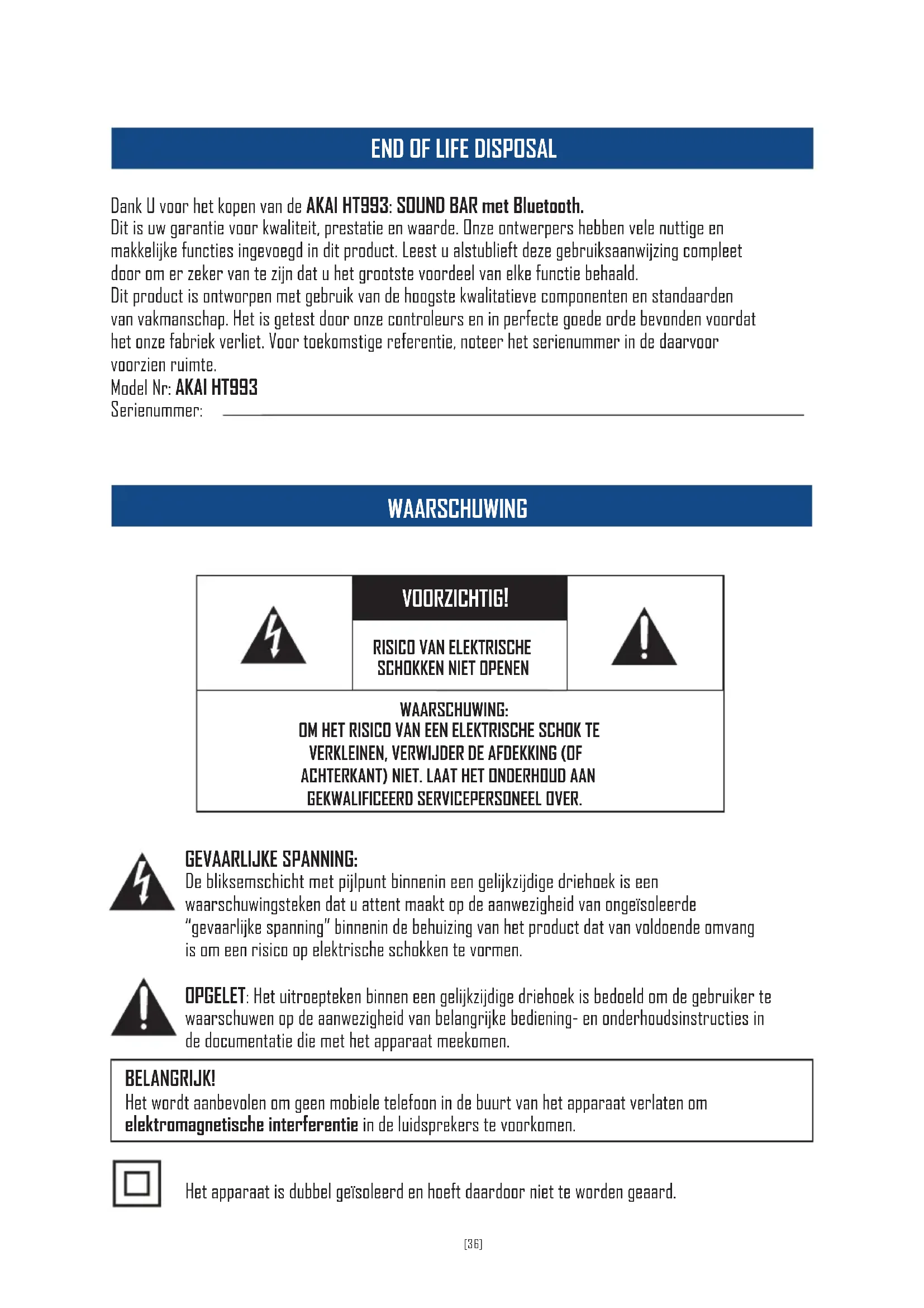 Dank U voor het kopen van de AKAI HT993: SOUND BAR met Bluetooth. Dit is uw garantie voor kwaliteit, prestatie en waarde. Onze ontwerpers hebben vele nuttige en makkelijke functies ingevoegd in dit product. Leest u alstublieft deze gebruiksaanwijzing compleet door om er zeker van te zijn dat u het grootste voordeel van elke functie behaald. Dit product is ontworpen met gebruik van de hoogste kwalitatieve componenten en standaarden van vakmanschap. Het is getest door onze controleurs en in perfecte goede orde bevonden voordat het onze fabriek verliet. Voor toekomstige referentie, noteer het serienummer in de daarvoor voorzien ruimte. Model Nr: AKAI HT993 Serienummer: WAARSCHUWING