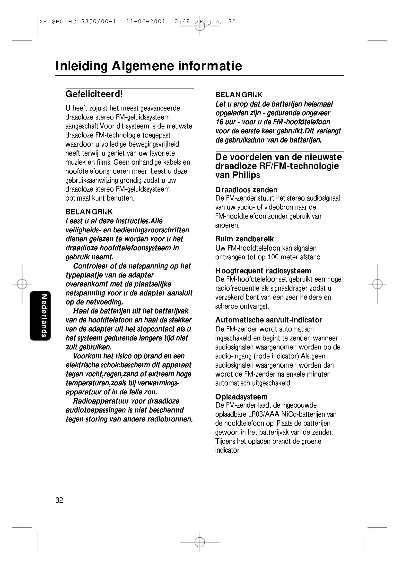 Gefeliciteerd! U heeft zojuist het meest geavanceerde draadloze stereo FM-geluidssysteem aangeschaft.Voor dit systeem is de nieuwste draadloze FM-technologie toegepast waardoor u volledige bewegingsvrijheid heeft terwijl u geniet van uw favoriete muziek en films. Geen onhandige kabels en hoofdtelefoonsnoeren meer! Leest u deze gebruiksaanwijzing grondig zodat u uw draadloze stereo FM-geluidssysteem optimaal kunt benutten. BELANGRIJK Leest u al deze instructies.Alle veiligheids- en bedieningsvoorschriften dienen gelezen te worden voor u het draadloze hoofdtelefoonsysteem in gebruik neemt. Controleer of de netspanning op het typeplaatje van de adapter overeenkomt met de plaatselijke netspanning voor u de adapter aansluit op de netvoeding. Haal de batterijen uit het batterijvak van de hoofdtelefoon en haal de stekker van de adapter uit het stopcontact als u het systeem gedurende langere tijd niet zult gebruiken. Voorkom het risico op brand en een elektrische schok:bescherm dit apparaat tegen vocht,regen,zand of extreem hoge temperaturen,zoals bij verwarmings- apparatuur of in de felle zon. Radioapparatuur voor draadloze audiotoepassingen is niet beschermd tegen storing van andere radiobronnen. BELANGRIJK Let u erop dat de batterijen helemaal opgeladen zijn - gedurende ongeveer 16 uur - voor u de FM-hoofdtelefoon voor de eerste keer gebruikt.Dit verlengt de gebruiksduur van de batterijen. De voordelen van de nieuwste draadloze RF/FM-technologie van Philips Draadloos zenden De FM-zender stuurt het stereo audiosignaal van uw audio- of videobron naar de FM-hoofdtelefoon zonder gebruik van snoeren. Ruim zendbereik Uw FM-hoofdtelefoon kan signalen ontvangen tot op 100 meter afstand. Hoogfrequent radiosysteem De FM-hoofdtelefoonset gebruikt een hoge radiofrequentie als signaaldrager zodat u verzekerd bent van een zeer heldere en scherpe ontvangst. Automatische aan/uit-indicator De FM-zender wordt automatisch ingeschakeld en begint te zenden wanneer audiosignalen waargenomen worden op de audio-ingang (rode indicator).Als geen audiosignalen waargenomen worden dan wordt de FM-zender na enkele minuten automatisch uitgeschakeld. Oplaadsysteem De FM-zender laadt de ingebouwde oplaadbare LR03/AAA NiCd-batterijen van de hoofdtelefoon op. Plaats de batterijen gewoon in het batterijvak van de zender. Tijdens het opladen brandt de groene indicator. Inleiding Algemene informatie XP SBC HC 8350/00-1 11-06-2001 10:48 Pagina 32Nederlands