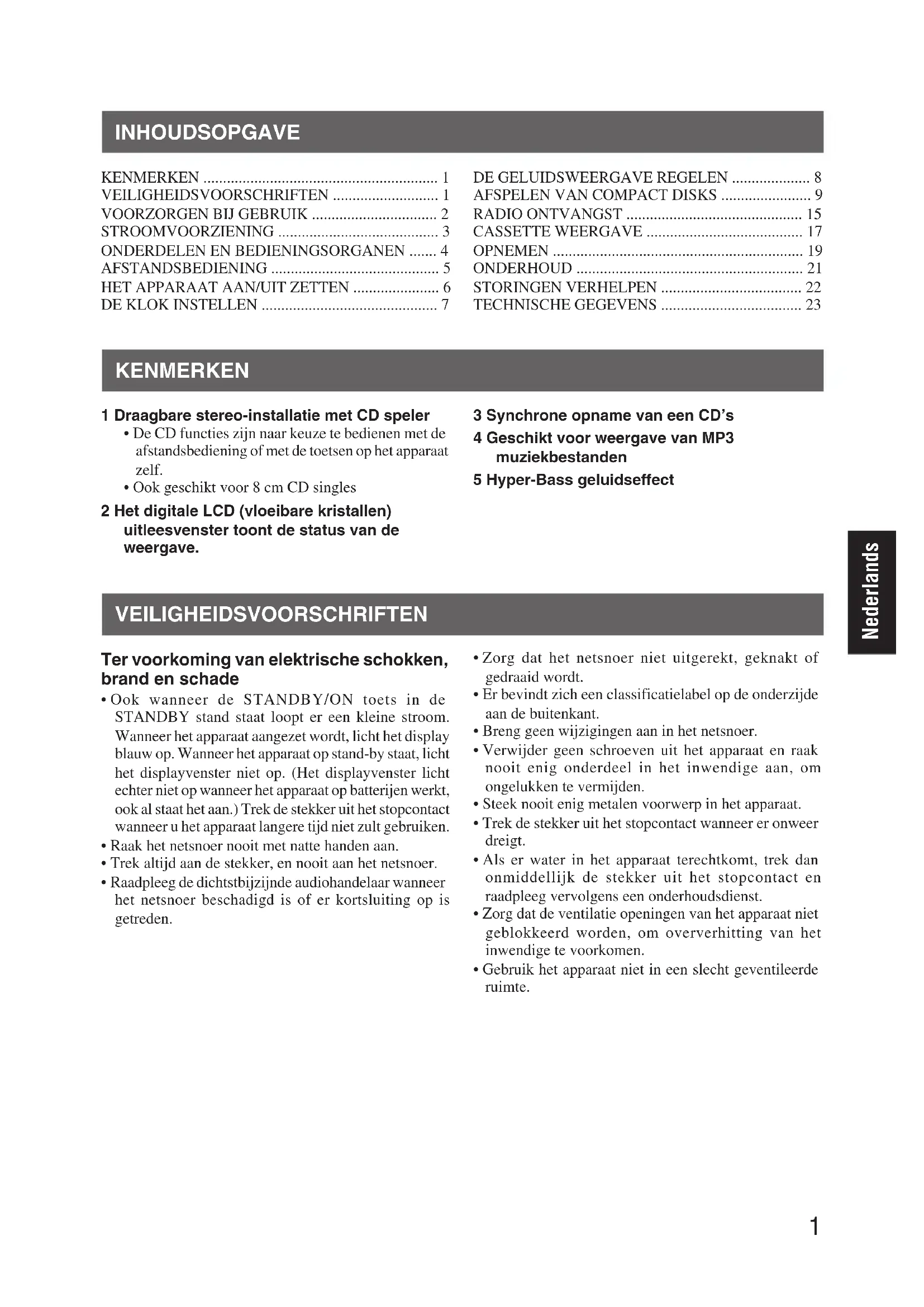 - Ook geschikt voor 8 cm CD singles 2 Het digitale LCD (vloeibare kristallen) uitleesvenster toont de status van de weergave. 3 Synchrone opname van een CD’s 4 Geschikt voor weergave van MP3 muziekbestanden 5 Hyper-Bass geluidseffect VEILIGHEIDSVOORSCHRIFTEN Ter voorkoming van elektrische schokken, brand en schade