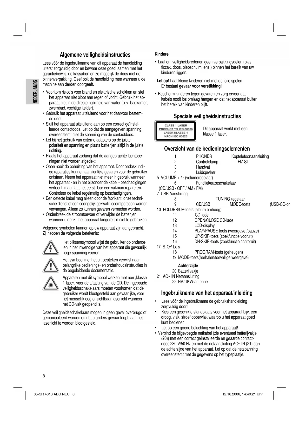 - Bescherm kinderen tegen gevaren en zorg ervoor dat kabels nooit los omlaag hangen en dat het apparaat buiten het bereik van kinderen blijft. Speciale veiligheidsinstructies Dit apparaat werkt met een klasse 1-laser. Overzicht van de bedieningselementen 1 PHONES Koptelefoonaansluiting 2 Controlelamp FM.ST 3 Handvat 4 Luidspreker 5 VOLUME + / - (volumeregelaar) 6 Functiekeuzeschakelaar (CD/USB / OFF / AM / FM) 7 USB Aansluiting 8 TUNING-regelaar 9 CD/USB MODE-toets (USB-CD-omschakeling) 10 FOLDER/UP-toets (album omhoog) 11 CD-lade 12 OPEN/CLOSE CD-lade 13 LCD-display 14 PLAY/PAUSE-toets (weergave-/pauze) 15 UP-SKIP-toets (zoekfunctie vooruit) 16 DN-SKIP-toets (zoekfunctie achteruit) 17 STOP toets 18 PROGRAM-toets (geheugen) 19 MODE-toets(herhalen/toevallige weergave) Achterzijde 20 Batterijvakje 21 AC~ IN Netaansluiting 22 FM/UKW-antenne Ingebruikname van het apparaat/inleiding