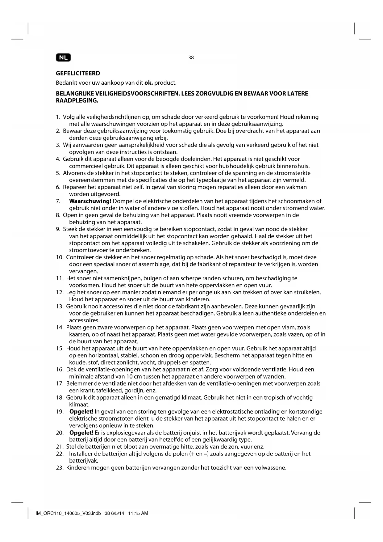 GEFELICITEERD Bedankt voor uw aankoop van dit ok. product. BELANGRIJKE VEILIGHEIDSVOORSCHRIFTEN. LEES ZORGVULDIG EN BEWAAR VOOR LATERE RAADPLEGING.