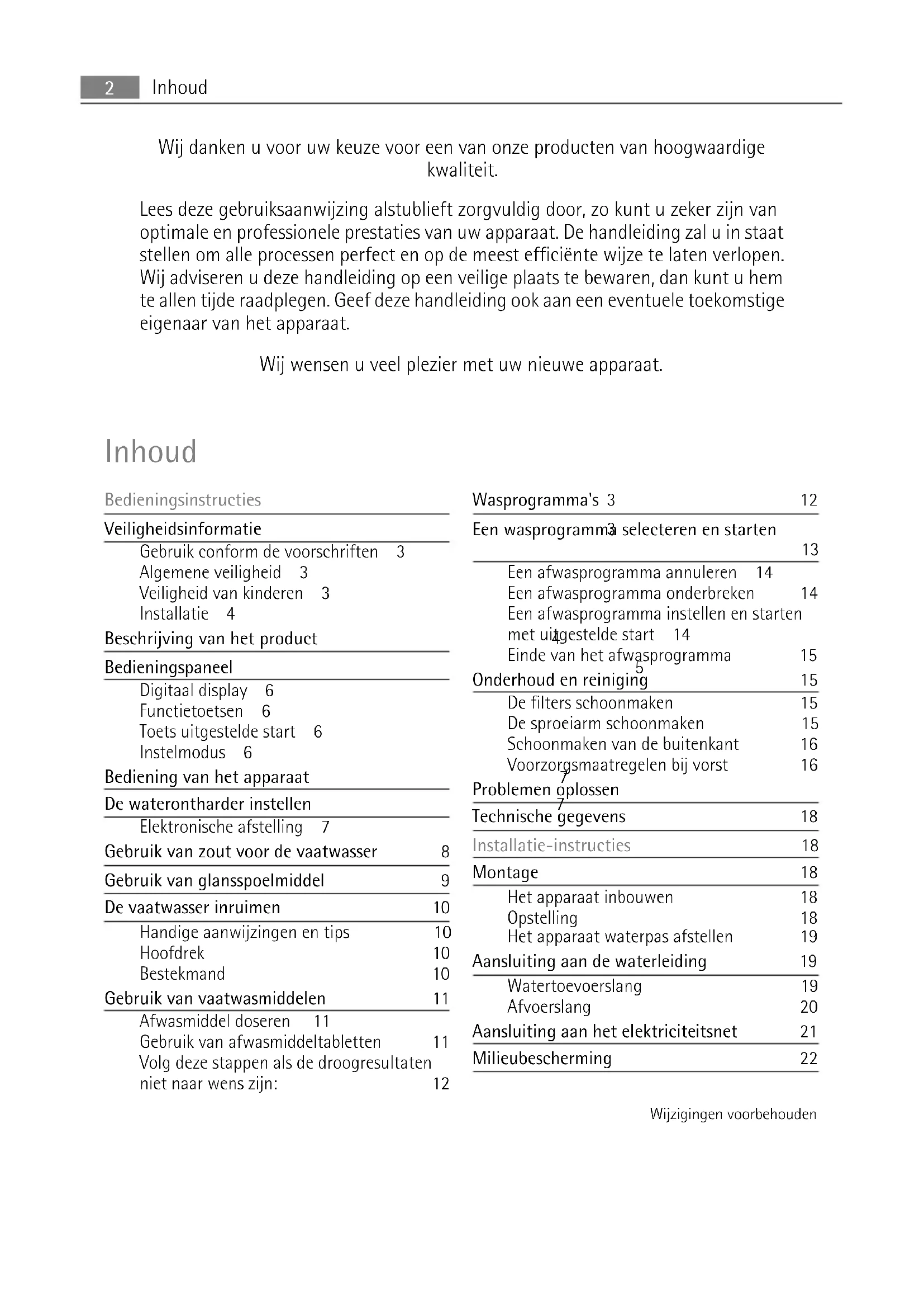 Een afwasprogramma annuleren 14 Een afwasprogramma onderbreken 14 Een afwasprogramma instellen en starten met uitgestelde start 14 Einde van het afwasprogramma 15 Onderhoud en reiniging 15 De filters schoonmaken 15 De sproeiarm schoonmaken 15 Schoonmaken van de buitenkant 16 Voorzorgsmaatregelen bij vorst 16 Problemen oplossen 16 Technische gegevens 18 Installatie-instructies 18 Montage 18 Het apparaat inbouwen 18 Opstelling 18 Het apparaat waterpas afstellen 19 Aansluiting aan de waterleiding 19 Watertoevoerslang 19 Afvoerslang 20 Aansluiting aan het elektriciteitsnet 21 Milieubescherming 22 Wijzigingen voorbehouden