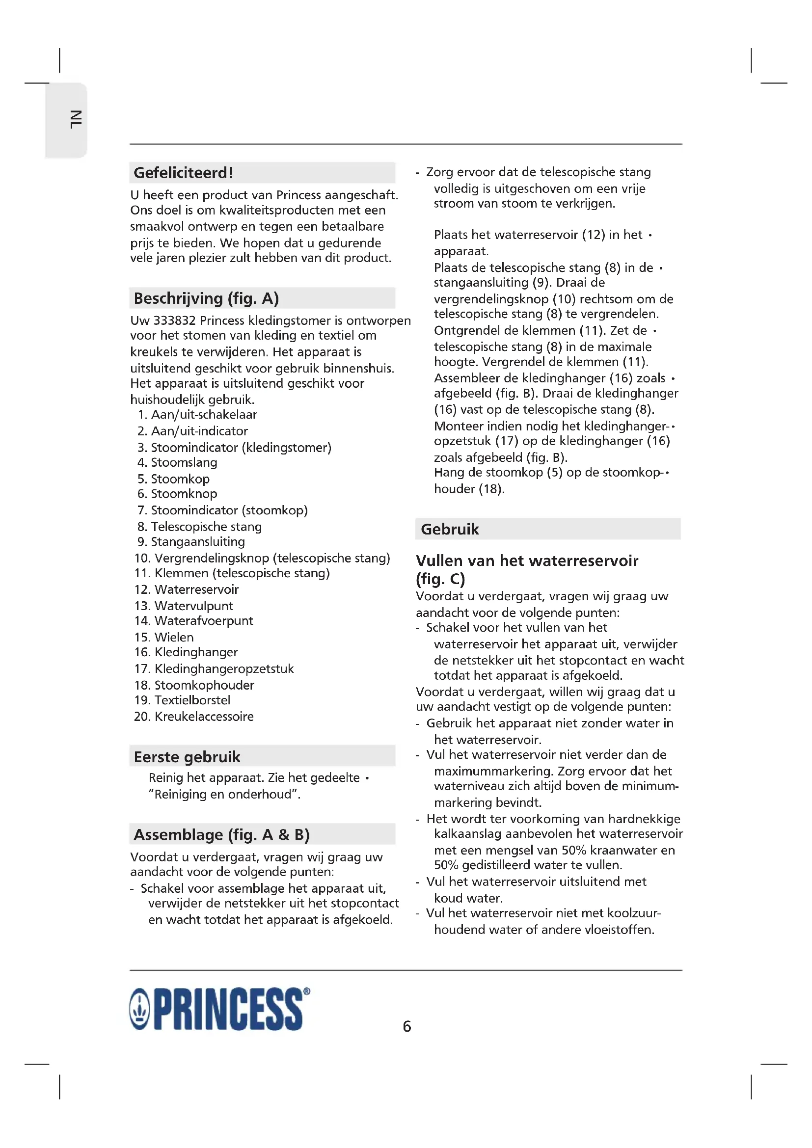 Gefeliciteerd! U heeft een product van Princess aangeschaft. Ons doel is om kwaliteitsproducten met een smaakvol ontwerp en tegen een betaalbare prijs te bieden. We hopen dat u gedurende vele jaren plezier zult hebben van dit product. Beschrijving (fig. A) Uw 333832 Princess kledingstomer is ontworpen voor het stomen van kleding en textiel om kreukels te verwijderen. Het apparaat is uitsluitend geschikt voor gebruik binnenshuis. Het apparaat is uitsluitend geschikt voor huishoudelijk gebruik.