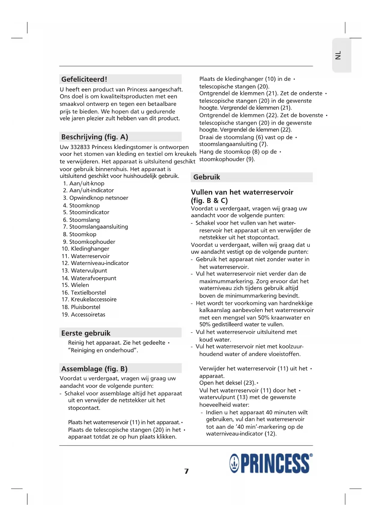 Voordat u verdergaat, willen wij graag dat u uw aandacht vestigt op de volgende punten: - Gebruik geen bijtende of schurende reinigingsmiddelen om het apparaat te reinigen. - Gebruik geen scherpe voorwerpen om het apparaat te reinigen. Controleer het apparaat regelmatig op • mogelijke schade. Controleer het waterreservoir regelmatig • op mogelijke lekkage. Reinig het apparaat na ieder gebruik:• - Houd de stoomslang in verticale positie, zodat eventuele condensatie terug in het waterreservoir kan vloeien. - Verwijder de stoomslang. - Leeg het waterreservoir door het water door het waterafvoerpunt in een gootsteen te laten lopen. - Monteer de stoomslang. - Verwijder kalkaanslag en andere vervuilende stoffen van de stoomkop met een vochtige doek en een niet-schurend reinigingsmiddel. - Reinig de behuizing met een zachte, vochtige doek. Ontkalken van het apparaat (fig. A) Het apparaat moet regelmatig worden ontkalkt. Indien het apparaat moet worden ontkalkt, gebruik dan een geschikt ontkalkings middel. Speciale ontkalkingsmiddelen zijn verkrijgbaar bij ons servicestation. Let op: Princess is niet aansprakelijk voor schade veroorzaakt door ontkalkingsmiddelen. Schade veroorzaakt door het niet regelmatig ontkalken van het apparaat wordt niet gedekt door de garantie. Voordat u verdergaat, vragen wij graag uw aandacht voor de volgende punten: - Verwijder voor het ontkalken van het apparaat de netstekker uit het stopcontact en wacht totdat het apparaat is afgekoeld. - Dompel het apparaat niet onder in water of andere vloeistoffen. Voordat u verdergaat, willen wij graag dat u uw aandacht vestigt op de volgende punten: - Wees voorzichtig tijdens het ontkalken van het apparaat om beschadiging van meubels of kleding te voorkomen. - Gebruik geen citroenzuur om het apparaat te ontkalken. Vul het waterreservoir (11) met een geschikt • ontkalkingsmiddel. Plaats de netstekker in het stopcontact. • De aan/uit-indicator (2) brandt rood. Schakel het apparaat in met behulp van de • aan/uit-knop (1). Het apparaat begint met opwarmen. De aan/uit-indicator (2) knippert tijdens het opwarmen. Laat het apparaat gedurende 10 minuten • lopen zonder kleding te stomen. Schakel het apparaat uit met behulp van de • aan/uit-schakelaar (1). De aan/uit-indicator (2) brandt rood. Verwijder de netstekker uit het stopcontact. • De aan/uit-indicator (2) gaat uit. Laat het apparaat volledig afkoelen.• Leeg het waterreservoir (11) door het ont-• kalkingsmiddel door het waterafvoerpunt (10) in een gootsteen te laten lopen. Spoel het apparaat grondig met schoon • water. Droog het apparaat grondig met een • schone, droge doek. Opbergen Doe de accessoires in de accessoiretas. • Berg het apparaat op in de originele • verpakking wanneer het niet in gebruik is. Berg het apparaat op op een droge en • vorstvrije plaats, buiten bereik van kinderen. Veiligheidsinstructies Algemene veiligheid Lees voor gebruik de gebruiksaanwijzing • zorgvuldig door. Bewaar de gebruiksaan- wijzing voor toekomstig gebruik. Gebruik het apparaat en de accessoires • uitsluitend voor hun beoogde doeleinden. Gebruik het apparaat en de accessoires niet voor andere doeleinden dan beschreven in de gebruiksaanwijzing.11