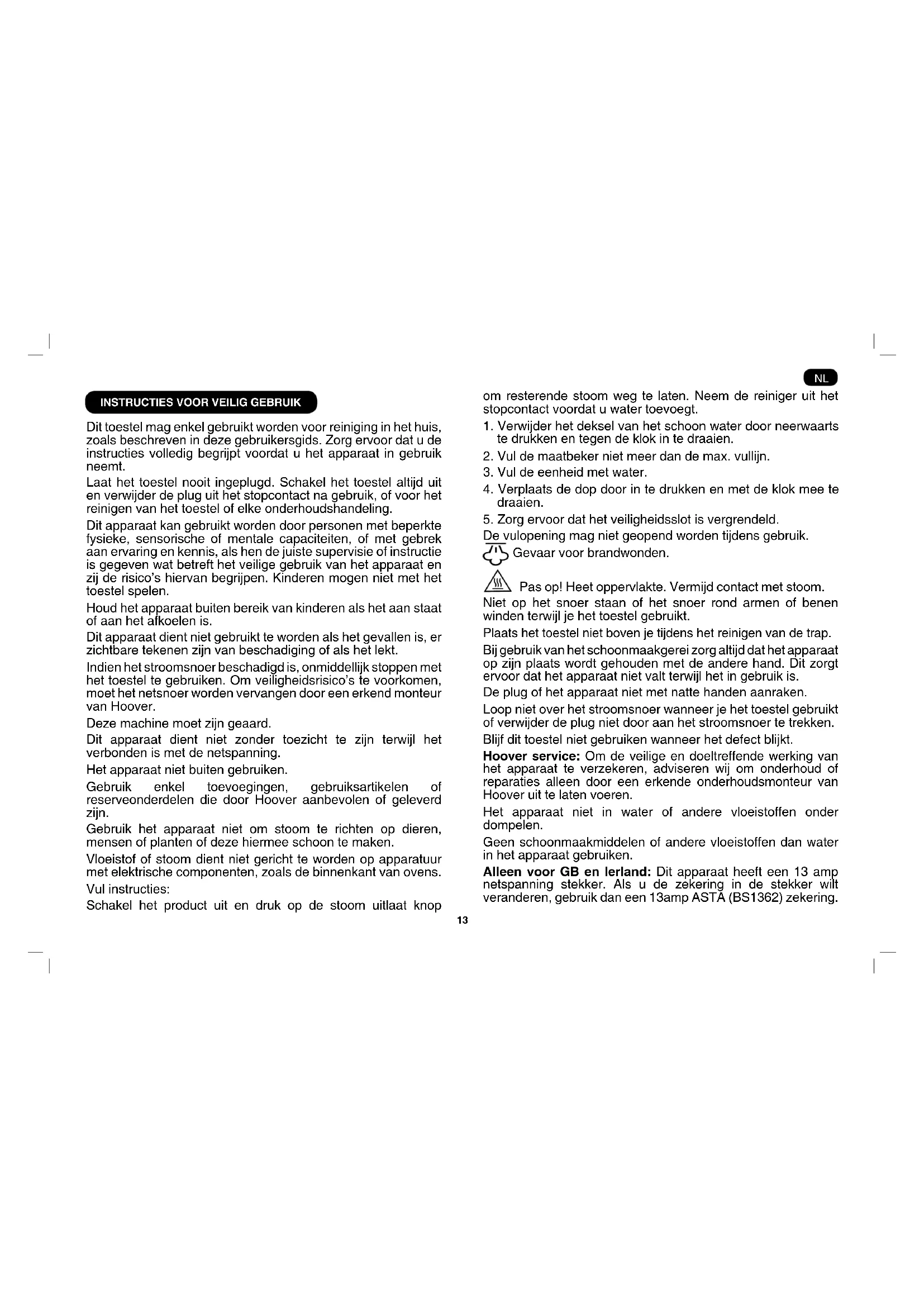 Dit toestel mag enkel gebruikt worden voor reiniging in het huis, zoals beschreven in deze gebruikersgids. Zorg ervoor dat u de instructies volledig begrijpt voordat u het apparaat in gebruik neemt. Laat het toestel nooit ingeplugd. Schakel het toestel altijd uit en verwijder de plug uit het stopcontact na gebruik, of voor het reinigen van het toestel of elke onderhoudshandeling. Dit apparaat kan gebruikt worden door personen met beperkte fysieke, sensorische of mentale capaciteiten, of met gebrek aan ervaring en kennis, als hen de juiste supervisie of instructie is gegeven wat betreft het veilige gebruik van het apparaat en zij de risico’s hiervan begrijpen. Kinderen mogen niet met het toestel spelen. Houd het apparaat buiten bereik van kinderen als het aan staat of aan het afkoelen is. Dit apparaat dient niet gebruikt te worden als het gevallen is, er zichtbare tekenen zijn van beschadiging of als het lekt. Indien het stroomsnoer beschadigd is, onmiddellijk stoppen met het toestel te gebruiken. Om veiligheidsrisico’s te voorkomen, moet het netsnoer worden vervangen door een erkend monteur van Hoover. Deze machine moet zijn geaard. Dit apparaat dient niet zonder toezicht te zijn terwijl het verbonden is met de netspanning. Het apparaat niet buiten gebruiken. Gebruik enkel toevoegingen, gebruiksartikelen of reserveonderdelen die door Hoover aanbevolen of geleverd zijn. Gebruik het apparaat niet om stoom te richten op dieren, mensen of planten of deze hiermee schoon te maken. Vloeistof of stoom dient niet gericht te worden op apparatuur met elektrische componenten, zoals de binnenkant van ovens. Vul instructies: Schakel het product uit en druk op de stoom uitlaat knop om resterende stoom weg te laten. Neem de reiniger uit het stopcontact voordat u water toevoegt.