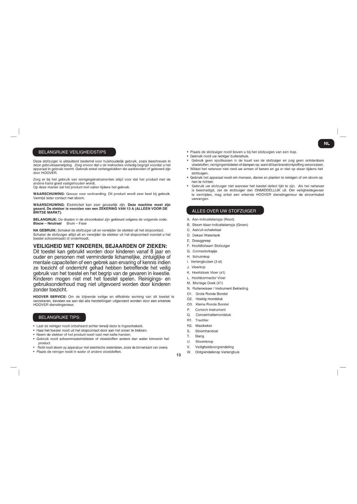 BELANGRIJKE VEILIGHEIDSTIPS Deze stofzuiger is uitsluitend bestemd voor huishoudelijk gebruik, zoals beschreven in deze gebruiksaanwijzing. Zorg ervoor dat u de instructies volledig begrijpt voordat u het apparaat in gebruik neemt. Gebruik enkel verlengstukken die aanbevolen of geleverd zijn door HOOVER. Zorg er bij het gebruik van reinigingsinstrumenten altijd voor dat het product met de andere hand goed vastgehouden wordt. Op deze manier zal het product niet vallen tijdens het gebruik. WAARsCHuWING: Gevaar voor verbranding. Dit product wordt zeer heet bij gebruik. Vermijd ieder contact met stoom. WAARsCHuWING: Elektriciteit kan zeer gevaarlijk zijn. Deze machine moet zijn geaard. De stekker is voorzien van een ZEKERING VAN 13 A (ALLEEN VOOR DE BRITse mARKT). BelANGRIJK: De draden in de stroomkabel zijn gekleurd volgens de volgende code: Blauw – Neutraal Bruin – Fase NA GeBRuIK: Schakel de stofzuiger uit en verwijder de stekker uit het stopcontact. Schakel de stofzuiger altijd uit en verwijder de stekker uit het stopcontact voordat u het toestel schoonmaakt of onderhoudt. VeIlIGHeID meT KINDeReN, BeJAARDeN of ZIeKeN: Dit toestel kan gebruikt worden door kinderen vanaf 8 jaar en ouder en personen met verminderde lichamelijke, zintuiglijke of mentale capaciteiten of een gebrek aan ervaring of kennis indien ze toezicht of onderricht gehad hebben betreffende het veilig gebruik van het toestel en het begrip van de gevaren in kwestie. Kinderen mogen niet met het toestel spelen. Reinigings- en gebruiksonderhoud mag niet uitgevoerd worden door kinderen zonder toezicht. HooVeR seRVICe: Om de blijvende veilige en efciënte werking van dit toestel te verzekeren, bevelen we aan dat alle herstellingen uitgevoerd worden door een erkende HOOVER dienstingenieur. BELANGRIJKE TIPS: