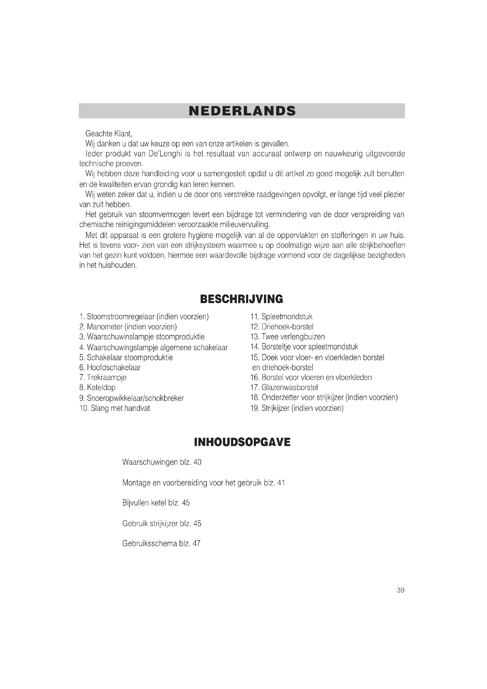 Geachte Klant, Wij danken u dat uw keuze op een van onze artikelen is gevallen. Ieder produkt van De’Longhi is het resultaat van accuraat ontwerp en nauwkeurig uitgevoerde technische proeven. Wij hebben deze handleiding voor u samengestelt opdat u dit artikel zo goed mogelijk zult benutten en de kwaliteiten ervan grondig kan leren kennen. Wij weten zeker dat u, indien u de door ons verstrekte raadgevingen opvolgt, er lange tijd veel plezier van zult hebben. Het gebruik van stoomvermogen levert een bijdrage tot vermindering van de door verspreiding van chemische reinigingsmiddelen veroorzaakte milieuvervuiling. Met dit apparaat is een grotere hygiene mogelijk van al de oppervlakten en stofferingen in uw huis. Het is tevens voor- zien van een strijksysteem waarmee u op doelmatige wijze aan alle strijkbehoeften van het gezin kunt voldoen, hiermee een waardevolle bijdrage vormend voor de dagelijkse bezigheden in het huishouden. BESCHRIJVING