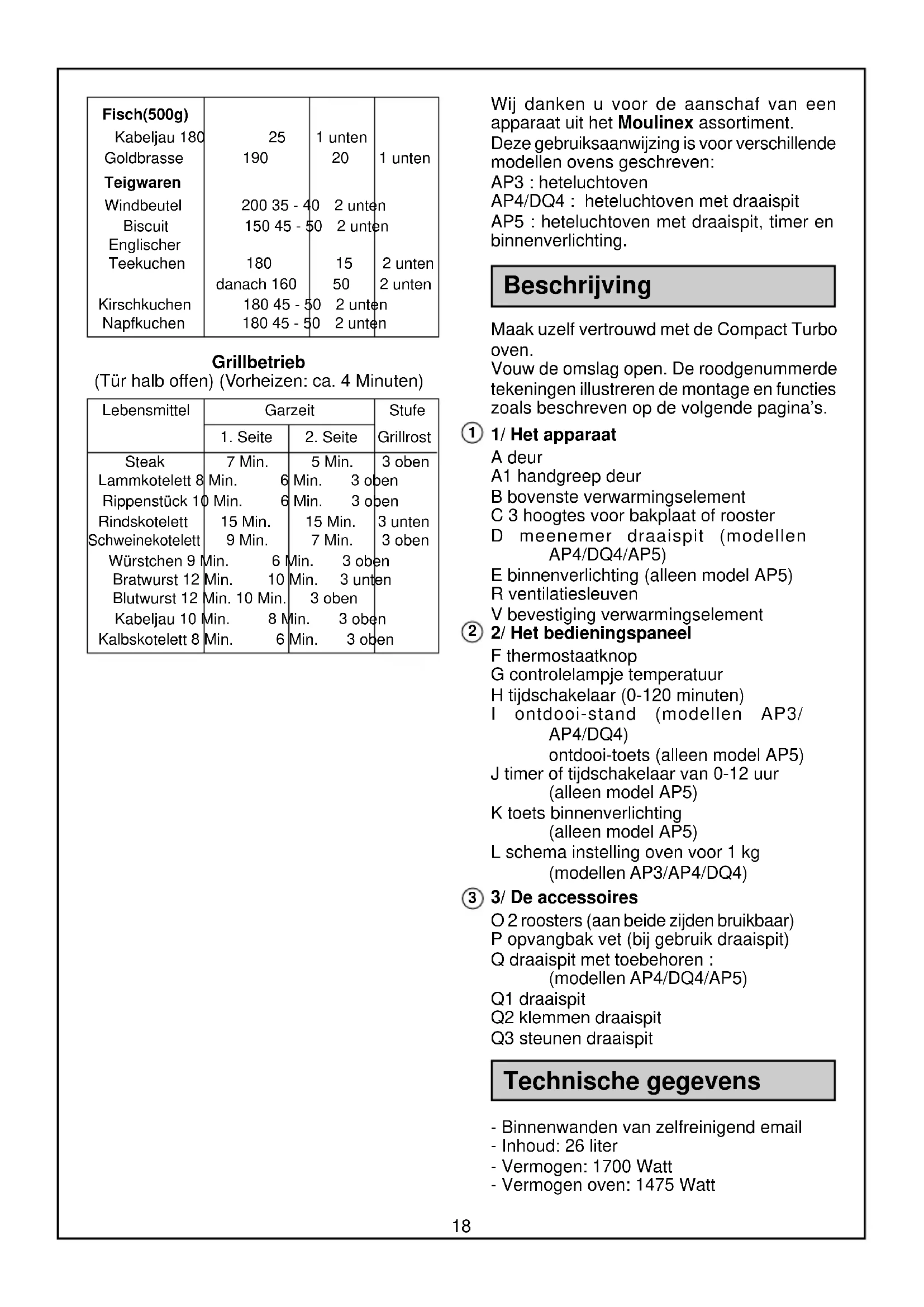 Wij danken u voor de aanschaf van een apparaat uit het Moulinex assortiment. Deze gebruiksaanwijzing is voor verschillende modellen ovens geschreven: AP3 : heteluchtoven AP4/DQ4 : heteluchtoven met draaispit AP5 : heteluchtoven met draaispit, timer en binnenverlichting. Beschrijving Maak uzelf vertrouwd met de Compact Turbo oven. Vouw de omslag open. De roodgenummerde tekeningen illustreren de montage en functies zoals beschreven op de volgende pagina’s. 1/ Het apparaat A deur A1 handgreep deur B bovenste verwarmingselement C 3 hoogtes voor bakplaat of rooster D meenemer draaispit (modellen AP4/DQ4/AP5) E binnenverlichting (alleen model AP5) R ventilatiesleuven V bevestiging verwarmingselement 2/ Het bedieningspaneel F thermostaatknop G controlelampje temperatuur H tijdschakelaar (0-120 minuten) I ontdooi-stand (modellen AP3/ AP4/DQ4) ontdooi-toets (alleen model AP5) J timer of tijdschakelaar van 0-12 uur (alleen model AP5) K toets binnenverlichting (alleen model AP5) L schema instelling oven voor 1 kg (modellen AP3/AP4/DQ4) 3/ De accessoires O 2 roosters (aan beide zijden bruikbaar) P opvangbak vet (bij gebruik draaispit) Q draaispit met toebehoren : (modellen AP4/DQ4/AP5) Q1 draaispit Q2 klemmen draaispit Q3 steunen draaispit Technische gegevens - Binnenwanden van zelfreinigend email - Inhoud: 26 liter - Vermogen: 1700 Watt - Vermogen oven: 1475 Watt