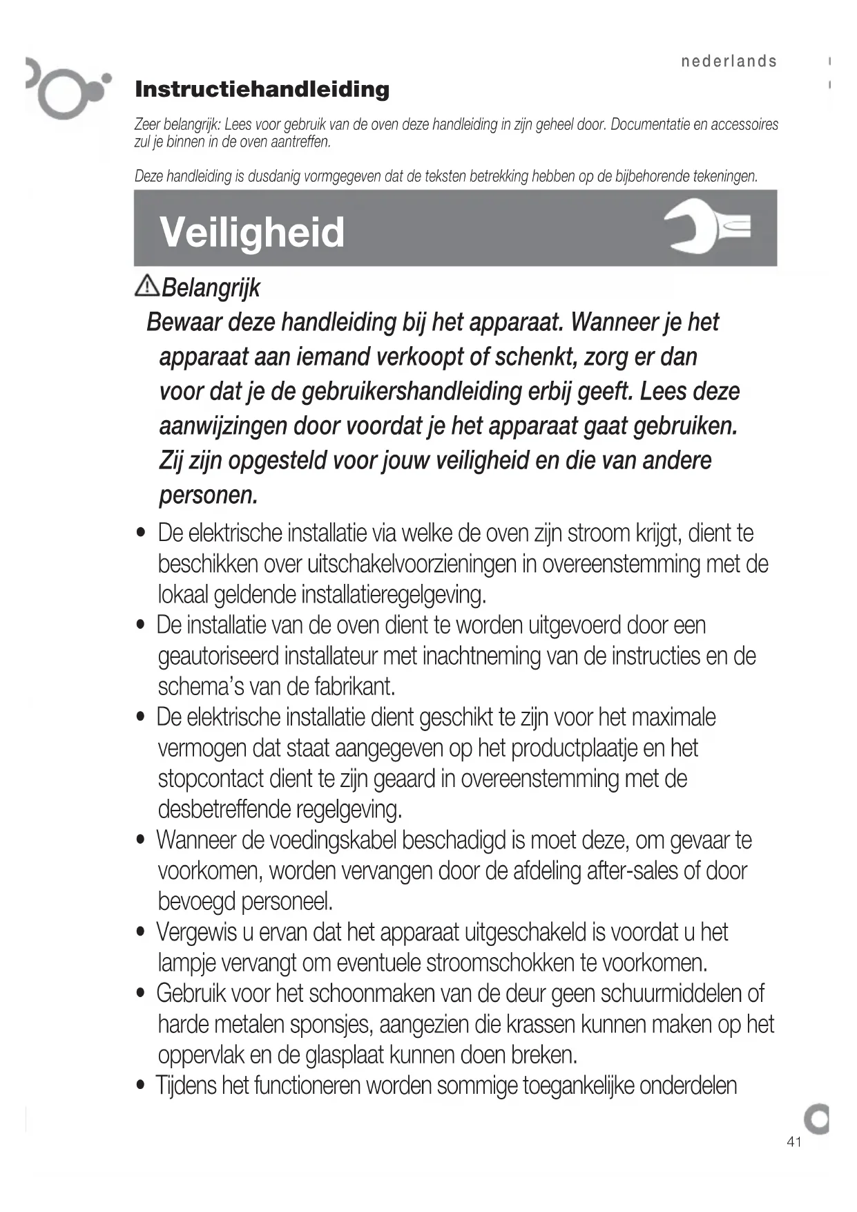 nederlands Instructiehandleiding Zeer belangrijk: Lees voor gebruik van de oven deze handleiding in zijn geheel door. Documentatie en accessoires zul je binnen in de oven aantreffen. Deze handleiding is dusdanig vormgegeven dat de teksten betrekking hebben op de bijbehorende tekeningen. Veiligheid Belangrijk Bewaar deze handleiding bij het apparaat. Wanneer je het apparaat aan iemand verkoopt of schenkt, zorg er dan voor dat je de gebruikershandleiding erbij geeft. Lees deze aanwijzingen door voordat je het apparaat gaat gebruiken. Zij zijn opgesteld voor jouw veiligheid en die van andere personen.