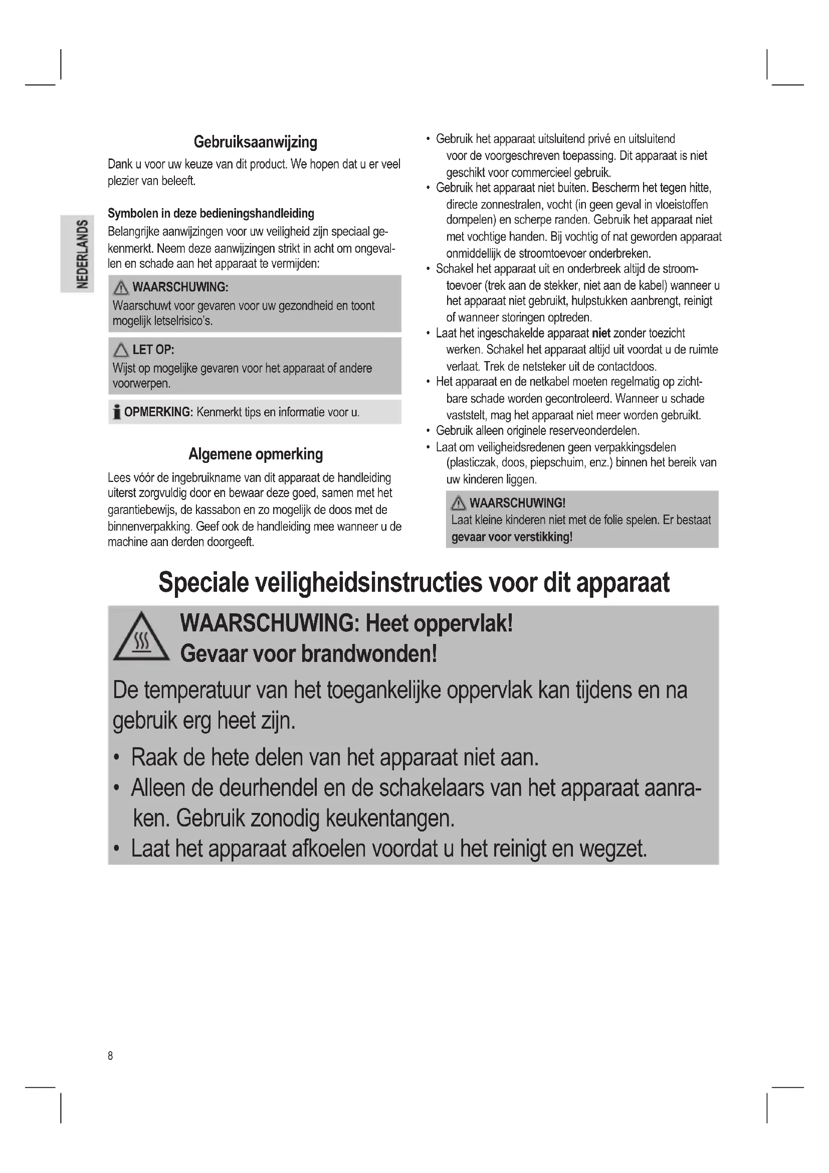 De temperatuur van het toegankelijkke oppervlak kanijdens en na gebruik erg heet+zijn.