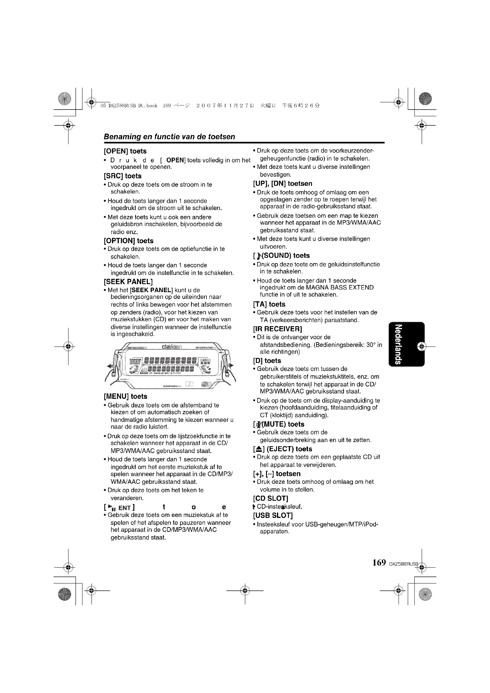 Geluidherstelfunctie-aanduiding Bluetooth-aanduidingST : Stereo-aanduiding (alleen radio)MANU : Handmatig-aanduidingAF : Aanduiding voor alternatieve frequentieREG : Regionaal-aanduidingTA : Verkeersbericht-aanduidingTP : Verkeersprogramma-aanduidingPTY : Programmatype-aanduiding : Discnummer-aanduiding Voorkeurzender-aanduiding (1 t/m 6) : MAGNA BASS EX aanduiding : Disc- of mapaanduiding : Willekeurig-aanduiding : Herhalen-aanduiding : Intro-aanduiding : Invoeren-aanduiding : Gebruiksonderbreking-aanduiding ALL : Programmabron-aanduiding Hier worden CD, USB enz. aangegeven. Gebruiksstatus-aanduiding Hier worden de programmabron, titels, functie, instelling, kloktijd enz. aangegeven. Gebruiksstatus-aanduiding Hier worden de titels, frequentie, afstemband, kanaal, afspeeltijd enz. aangegeven. 05_DXZ588RUSB_DU.book 170 ページ 2007年11月27日 火曜日 午後6時26分171 DXZ588RUSB Nederlands