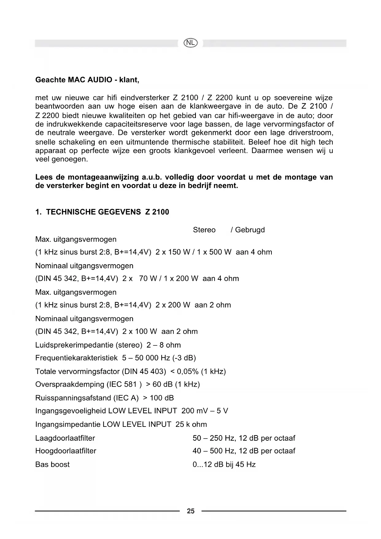 Geachte MAC AUDIO - klant, met uw nieuwe car hifi eindversterker Z 2100 / Z 2200 kunt u op soevereine wijze beantwoorden aan uw hoge eisen aan de klankweergave in de auto. De Z 2100 / Z 2200 biedt nieuwe kwaliteiten op het gebied van car hifi-weergave in de auto; door de indrukwekkende capaciteitsreserve voor lage bassen, de lage vervormingsfactor of de neutrale weergave. De versterker wordt gekenmerkt door een lage driverstroom, snelle schakeling en een uitmuntende thermische stabiliteit. Beleef hoe dit high tech apparaat op perfecte wijze een groots klankgevoel verleent. Daarmee wensen wij u veel genoegen. Lees de montageaanwijzing a.u.b. volledig door voordat u met de montage van de versterker begint en voordat u deze in bedrijf neemt.