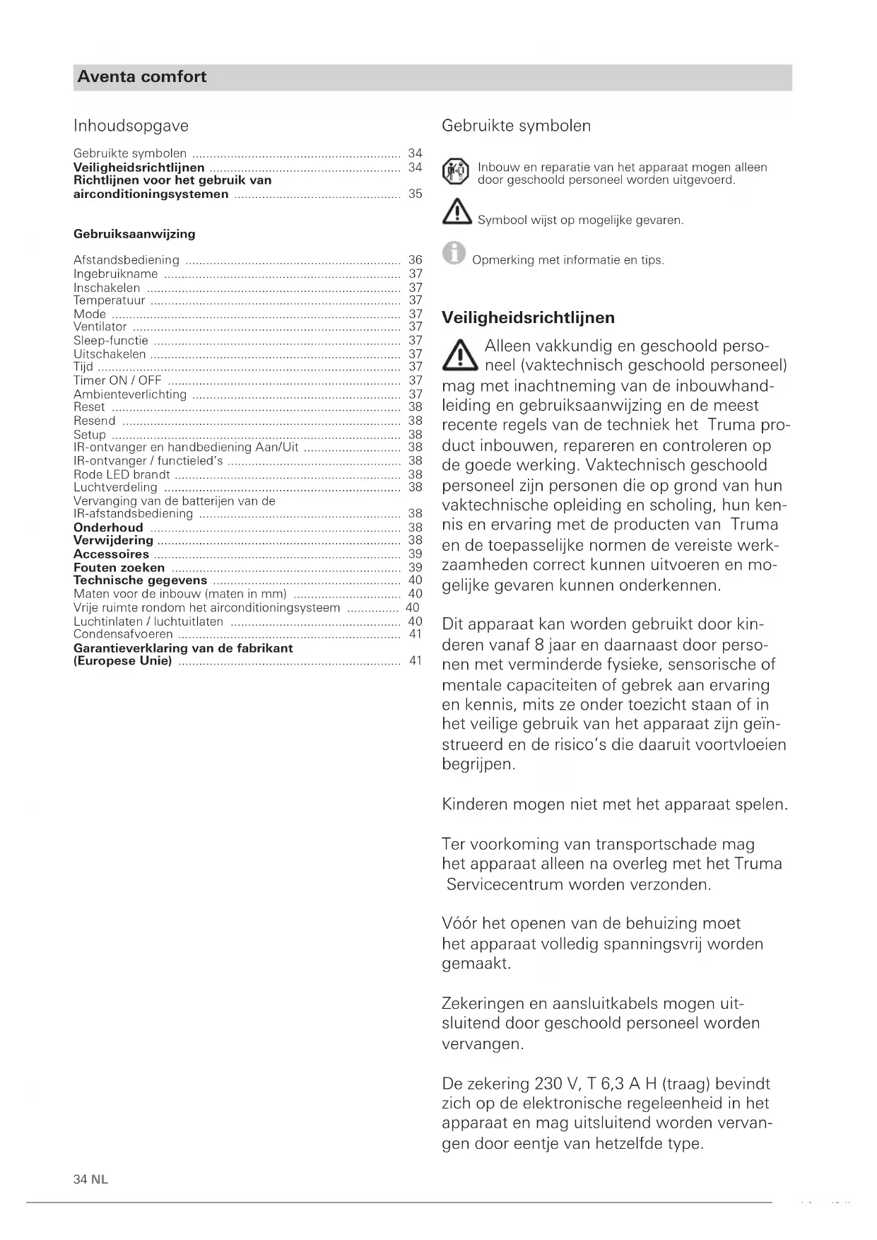 - Il diritto di garanzia deve essere esercitato presso un partner di assistenza autorizzato o il centro di assistenza Truma. Tut- ti gli indirizzi e i numeri di telefono sono disponibili sul sito www.truma.com nella sezione «Service». Per consentire lo svolgimento regolare, si prega di tenere a portata di mano le seguenti informazioni prima di contattare l’assistenza: – descrizione dettagliata del difetto – numero di matricola dell’apparecchio – data d’acquisto Il partner di assistenza autorizzato o il centro di assistenza Tru- ma stabiliranno le ulteriori modalità di procedura. Per evitare eventuali danni dovuti al trasporto, l’apparecchio in questione può essere inviato solo previo accordo con il partner di assi- stenza autorizzato o il centro di assistenza Truma. Se la garanzia viene accettata dal produttore, questi si farà carico dei costi di trasporto. Qualora il caso non sia coperto dalla garanzia, il consumatore ne sarà informato e i costi di riparazione e di trasporto saranno a suo carico. Si prega di astenersi dall’effettuare spedizioni prima di aver preso i relativi accordi.34 NL Aventa comfort Gebruikte symbolen Inbouw en reparatie van het apparaat mogen alleen door geschoold personeel worden uitgevoerd. Symbool wijst op mogelijke gevaren. Opmerking met informatie en tips. Veiligheidsrichtlijnen Alleen vakkundig en geschoold perso- neel (vaktechnisch geschoold personeel) mag met inachtneming van de inbouwhand- leiding en gebruiksaanwijzing en de meest recente regels van de techniek het Truma pro- duct inbouwen, repareren en controleren op de goede werking. Vaktechnisch geschoold personeel zijn personen die op grond van hun vaktechnische opleiding en scholing, hun ken- nis en ervaring met de producten van Truma en de toepasselijke normen de vereiste werk- zaamheden correct kunnen uitvoeren en mo- gelijke gevaren kunnen onderkennen. Dit apparaat kan worden gebruikt door kin- deren vanaf 8 jaar en daarnaast door perso- nen met verminderde fysieke, sensorische of mentale capaciteiten of gebrek aan ervaring en kennis, mits ze onder toezicht staan of in het veilige gebruik van het apparaat zijn geïn- strueerd en de risico’s die daaruit voortvloeien begrijpen. Kinderen mogen niet met het apparaat spelen. Ter voorkoming van transportschade mag het apparaat alleen na overleg met het Truma Servicecentrum worden verzonden. Vóór het openen van de behuizing moet het apparaat volledig spanningsvrij worden gemaakt. Zekeringen en aansluitkabels mogen uit- sluitend door geschoold personeel worden vervangen. De zekering 230 V, T 6,3 A H (traag) bevindt zich op de elektronische regeleenheid in het apparaat en mag uitsluitend worden vervan- gen door eentje van hetzelfde type. Inhoudsopgave Gebruikte symbolen p. 34