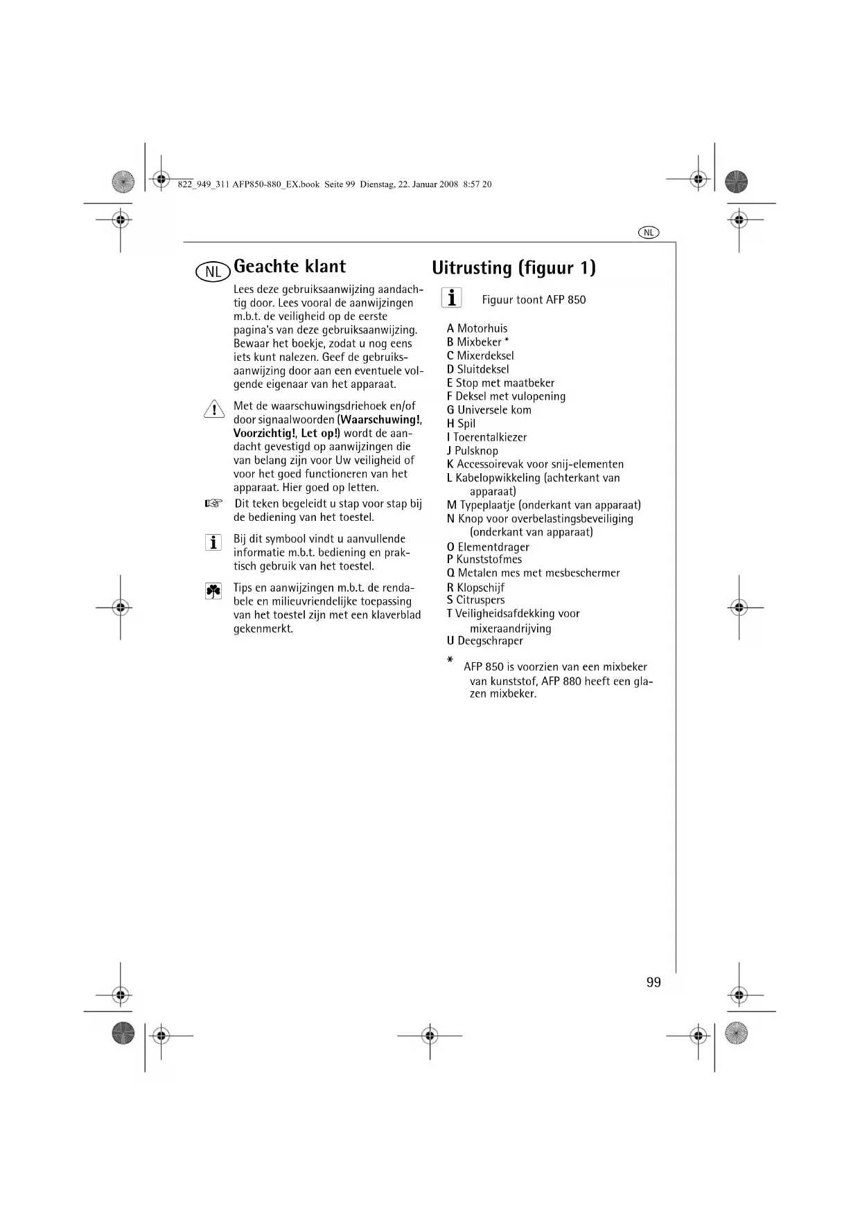 - AFP 850 is voorzien van een mixbeker van kunststof, AFP 880 heeft een gla-zen mixbeker. 822_949_311 AFP850-880_EX.book Seite 99 Dienstag, 22. Januar 2008 8:57 20l
