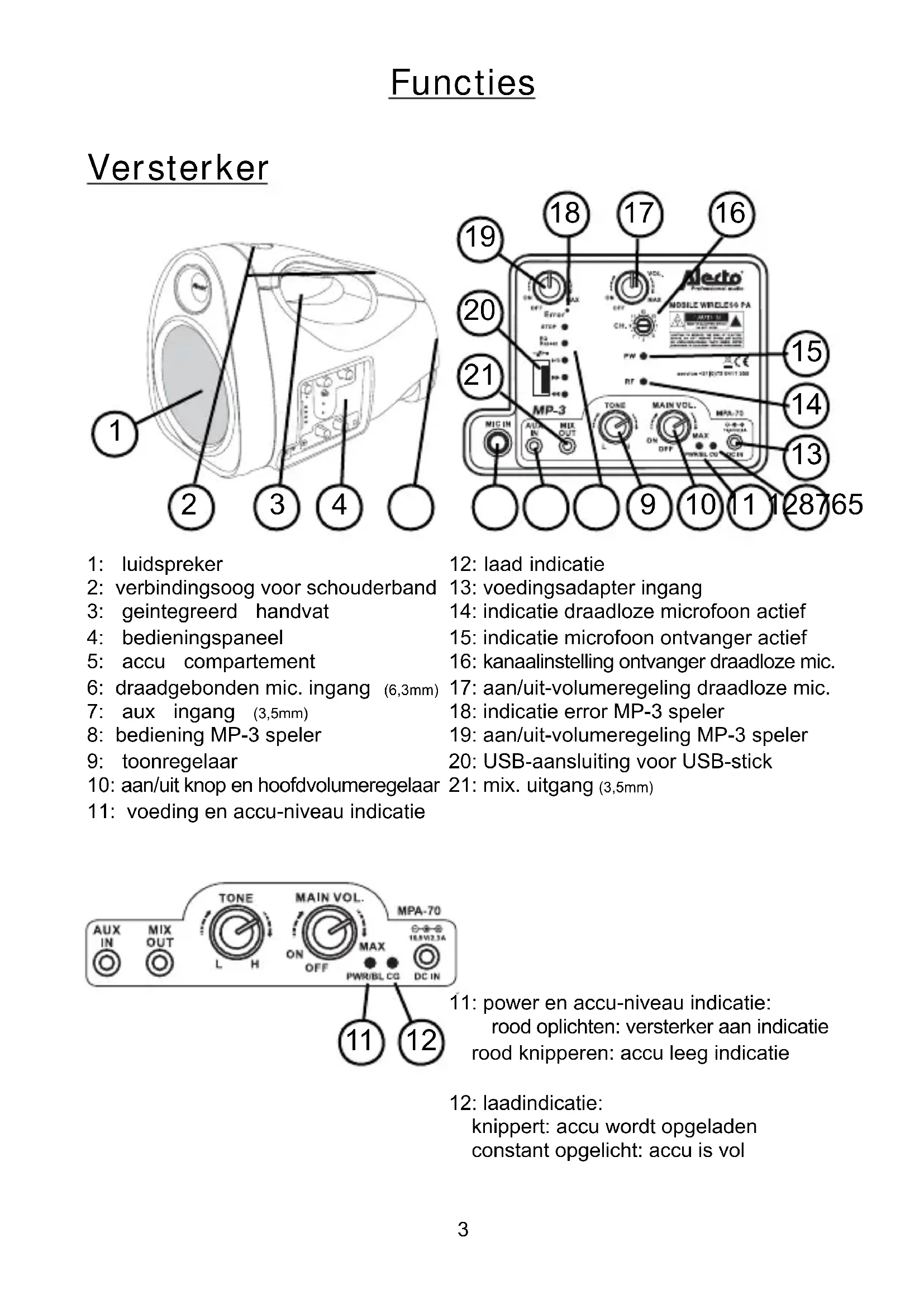 VOOR GEBRUIK De MPA-70 functioneert op de ingebouwde accu mits deze goed is opgela- den. Mocht de accu onvoldoende zijn geladen, dan kan de versterker ook functioneren op het lichtnet waarbij tevens de accu wordt opgeladen. Let op, indien de MPA-70 in gebruik is zal het langer duren voordat de accu volledig geladen zal zijn. ACCU: Voordat u deze mobiele PA set kunt gebruiken dient u als eerste de interne accu op te laden. U kunt de set opladen met de meegeleverde adapter (100 ~ 240V). Mits de adapter is aangesloten op het lichtnet zal ook tijdens gebruik de accu worden opgeladen. Advies: Laat de MPA-70 met de adapter aan het lichtnet gekoppeld staan. De accu wordt dan middels druppelladen altijd netjes op spanning gehouden en de versterker is altijd klaar voor gebruik. De levensduur van accu zal hierdoor worden verlengd. De oplaadtijd van de accu is 7 tot 10 uur. Bij een lege accu duurt het ruim een half uur voordat u de MPA-70 op de accu kunt laten functioneren. LET OP: de verster- ker zal dan maar voor korte duur op de accu functioneren. Als de accu helemaal opgeladen is, dan kan de MPA-70 ongeveer 2 tot 5 uur op de accu functioneren. De gebruiksduur is ook afhankelijk van het gekozen geluidsvolume. Als tijdens gebruik de ‘PWR/BL LED’ rood knippert, moet de accu opgeladen worden. AUTOMATISCHE RUISONDERDRUKING: De versterker heeft een automatische ruisonderdrukking systeem. Dit houdt in dat als er nagenoeg geen geluid aanwezig is wordt het signaal onderdrukt en is er niets meer te horen. Is het aangeboden geluid iets harder dan wordt het geluid pas vrijgegeven en versterkt. Deze functie is alleen werkzaam op de draadloze microfoon en de externe micro- foon ingang.6 DRAADLOZE MICROFOON: De microfoon dient voorzien te worden van 2 x AA 1.5Volt penlite batterijen. Het verdient de voorkeur om hiervoor alkaline batterijen te gebruiken en geen oplaadbare NiCd of NiMh batterijen. Dit heeft te maken met de ontlaadkarakteris- tiek van deze oplaadbare batterijen. In het batterijcompartiment van de draadloze microfoon zit ook een kleine draai- schakelaar (16 standen). Met deze draaischakelaar kan het gewenste zendkanaal ingesteld worden (1- 16). Het kanaal dat wordt gekozen dient ook op de MPA-70 ontvanger te worden gekozen. De ontvanger in de MPA-70 en de draadloze microfoon dienen dus op hetzelfde kanaal te staan. Schakel op de MPA-70 de ont- vanger voor de draadloze microfoon aan door de volumeknop van de microfoon ontvanger op ON te draaien. Regel het volume niet meteen helemaal open maar wacht tot de microfoon aanstaat en er in wordt gesproken. Met de schakelaar op de microfoon kan de microfoon worden aangezet. Als u de zender van de microfoon aanzet kan het even duren voordat de geluids- overdracht tot stand komt. Op de MPA-70 gaat nu de LED “RF” groen oplichten. Als de zender van de microfoon is ingeschakeld, licht ter indicatie de power LED op de microfoon groen op. Als de batterij beneden een bepaalde capaciteit komt zal de LED rood oplichten ten teken dat de batterij leeg is. U dient nu de batterij te vervangen, dit om te voorkomen dat de microfoon niet goed functioneert of plotseling stopt. Het volume van de draadloze microfoon kan worden geregeld op de versterker, met volume regeling Wireless MIC. LET OP: Als er niet in de microfoon wordt gesproken is de automatische ruison- derdrukking in werking, regelt u nu het volume van de MAIN VOL. regeling en van de ontvanger vrij hoog, kan het voorkomen dat wanneer de ruisonderdrukking uitschakelt de microfoon gaat rondzingen (piepen). Regel het volume dus op als er in de microfoon wordt gesproken. Dit geldt ook voor de externe MIC ingang.7 INSTELLINGEN VERSTERKER MAIN VOL. REGELAAR: Op de main volumeregelaar zit in het éérste regelbereik de aan uit schakelaar. Schakel de MPA-70 in door aan de regelaar te draaien totdat er een klik hoor- en voelbaar is. De MPA-70 is nu ingeschakeld. Met de main volumeregelaar kan ook het gezamenlijk volume van de MPA-70 worden geregeld. LET OP: Draai deze regelaar voordat u de set aanzet geheel linksom om te voorkomen dat het geluidsvolume te hoog is. TONE REGELING: Met de tone regeling is mogelijk de combinatie van hoge en lage tonen naar eigen smaak aan te passen. AUX IN INGANG: Op de AUX ingang (3,5 mm stereo jack plug) kan een externe geluidsbron worden aangesloten. Denk hierbij aan een DVD-speler, minidiskspeler, radio of een losse mp3 speler. Deze apparaten hebben een uitgang op line-niveau. Deze kunnen met de juiste kabels (niet meegeleverd) aangesloten worden op de AUX ingang van de set. Het volume van deze ingang kan alleen met de MAIN VOL. regelaar worden geregeld. MIX OUT UITGANG: Op de MIX OUT uitgang (3,5 mm stereo jack plug) kan een externe versterker of recorder worden aangesloten. Het aangeboden signaal gaat buiten de MAIN VOL. regeling om. Het volume van de externe microfoon ingang en van de AUX IN ingang hebben een vast volume. Het volume van de MP3 speler en de draadloze microfoon kunnen bijgeregeld worden. Met de toonregeling kan het MIX OUT signaal worden aangepast. MICROFOON INGANG: Op deze ingang kan een externe microfoon met draad worden aangesloten. Deze microfoon dient een dynamische microfoon (±600Ω) te zijn met een 6,3mm jack plug. ADAPTER AANSLUITING: Op de DC IN voedingsplug kan de meegeleverde voedingsadapter worden aange- sloten. Met deze adapter kan de interne accu worden geladen maar dient ook om de MPA-70 op het lichtnet (100 ~ 240V 50/60Hz) te laten werken.8 MP-3 SPELER: Op de volumeregelaar van de MP-3 speler zit in het éérste regelbereik ook een aan uit schakelaar. Schakel de MP3-unit in door aan de regelaar te draaien totdat er een klik hoor- en voelbaar is. De MP3-unit is nu ingeschakeld. Met dezelfde regelaar is ook het volume van de MP-3 te regelen. Plaats voor het afspelen een USB-stick met MP3 fi les in the USB aansluiting (USB