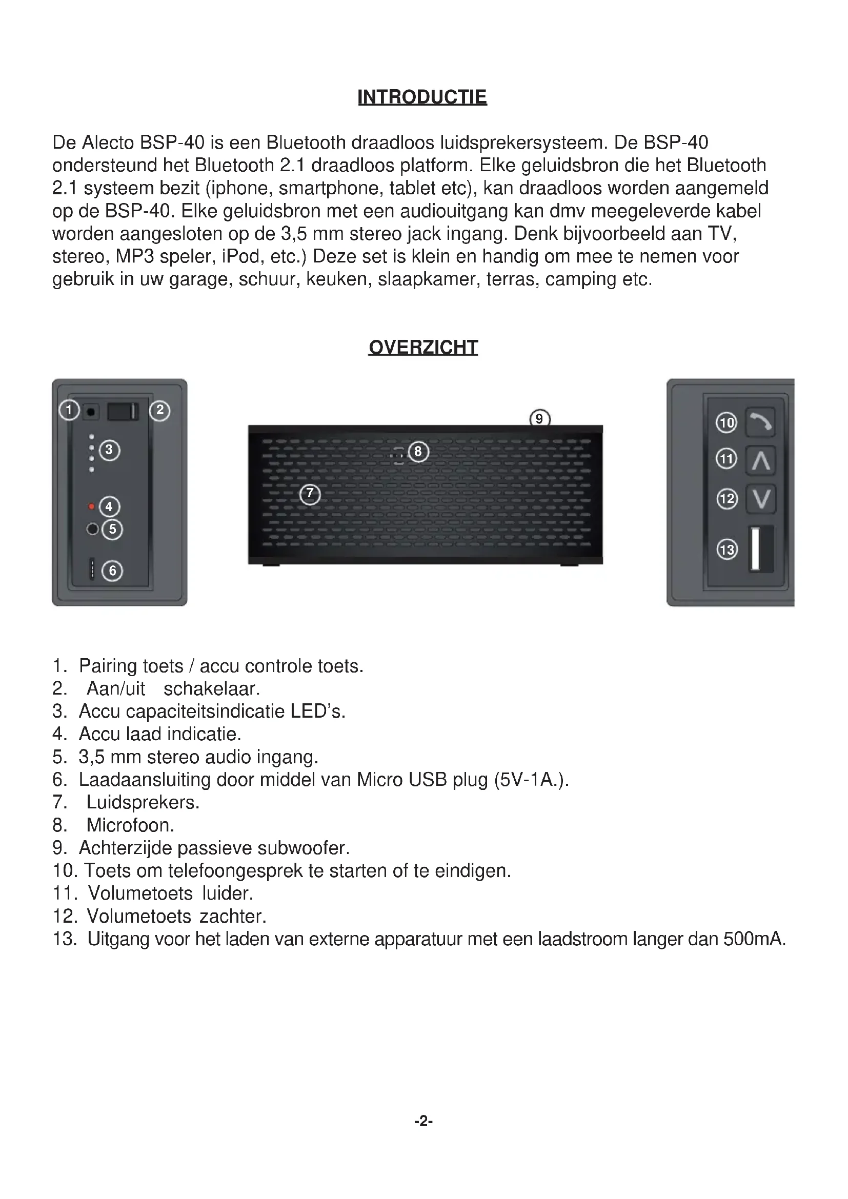 INTRODUCTIE De Alecto BSP-40 is een Bluetooth draadloos luidsprekersysteem. De BSP-40 ondersteund het Bluetooth 2.1 draadloos platform. Elke geluidsbron die het Bluetooth