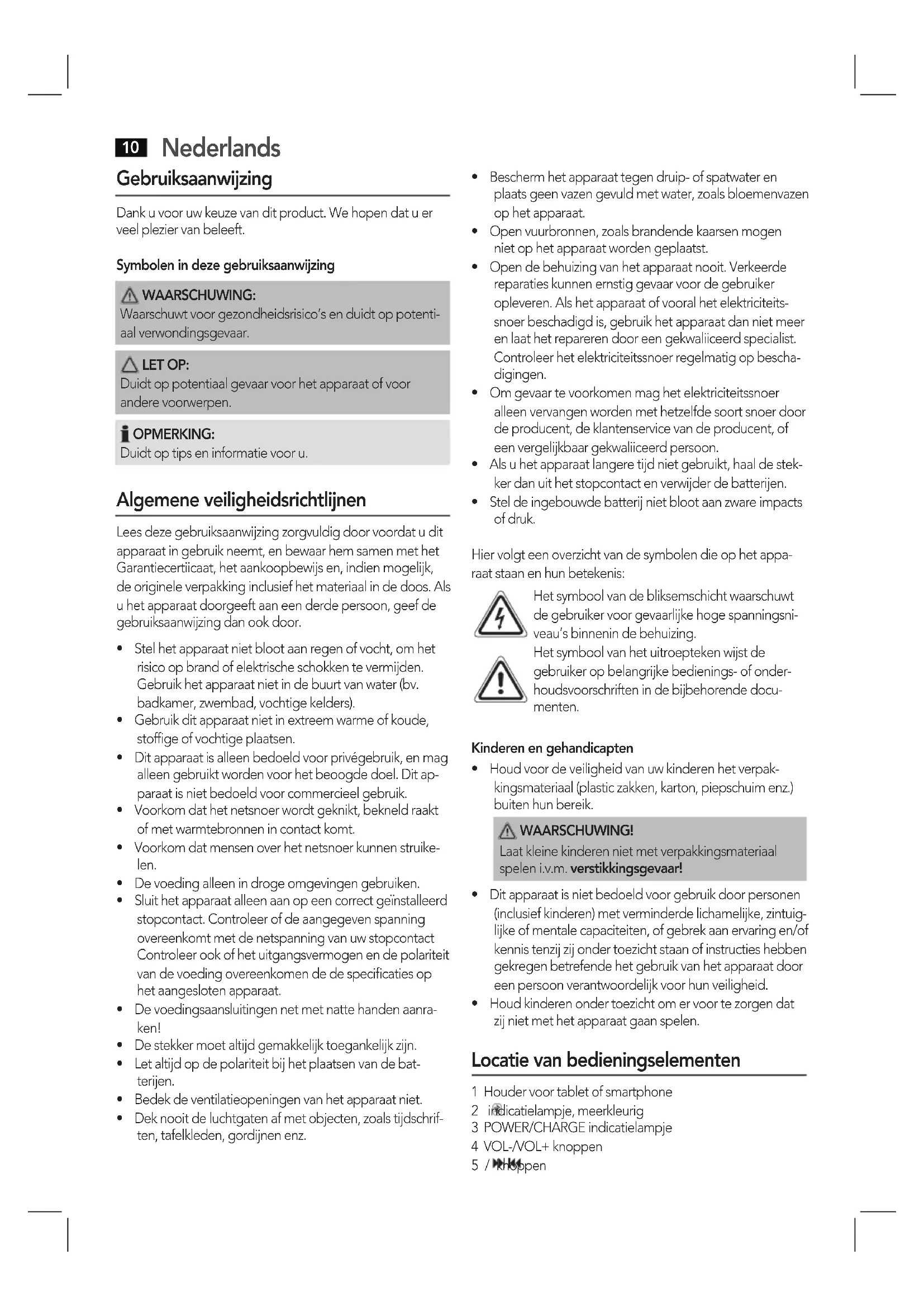 - Houdkinderenondertoezichtomervoortezorgendat zij niet met het apparaat gaan spelen. Locatie van bedieningselementen 1 Houder voor tablet of smartphone 2 indicatielampje, meerkleurig 3 POWER/CHARGE indicatielampje 4 VOL-/VOL+ knoppen 5 / knoppenNederlands