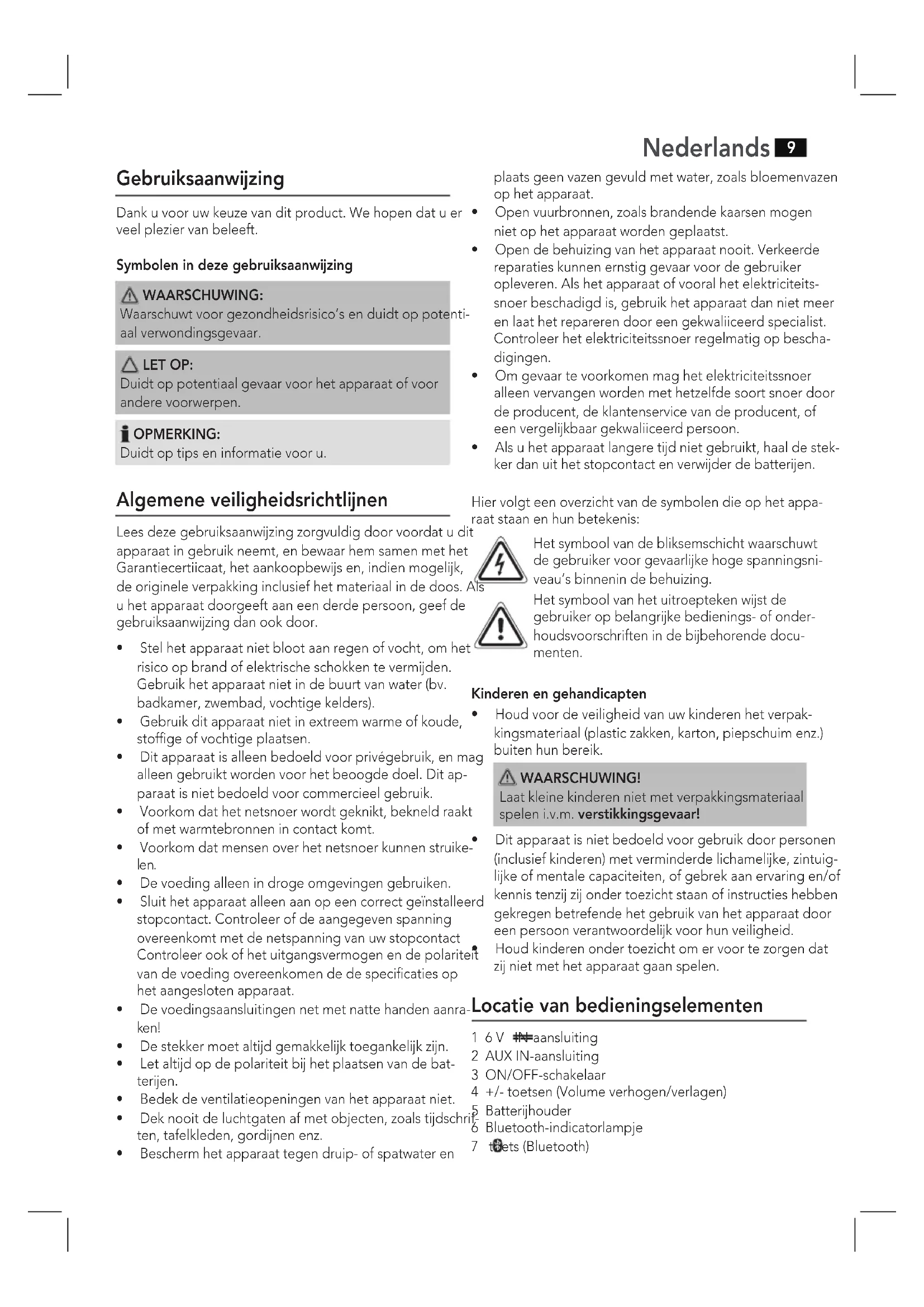 Dit apparaat is Niet bedoeld voor gebruik door Personen (inclusief kinderen) met verminderde lichamelijke, zintuig- lijke of mentale capaciteiten, of gebrek aan ervaring en/of kennis tenzij zij onder toezicht staan of instructies hebben gekregen betrefende het gebruik van het apparaat door een persoon verantwoordelijk voor hun veiligheid. Houd kinderen onder toezicht om er voor te zorgen dat zij Niet met het apparaat gaan spelen.