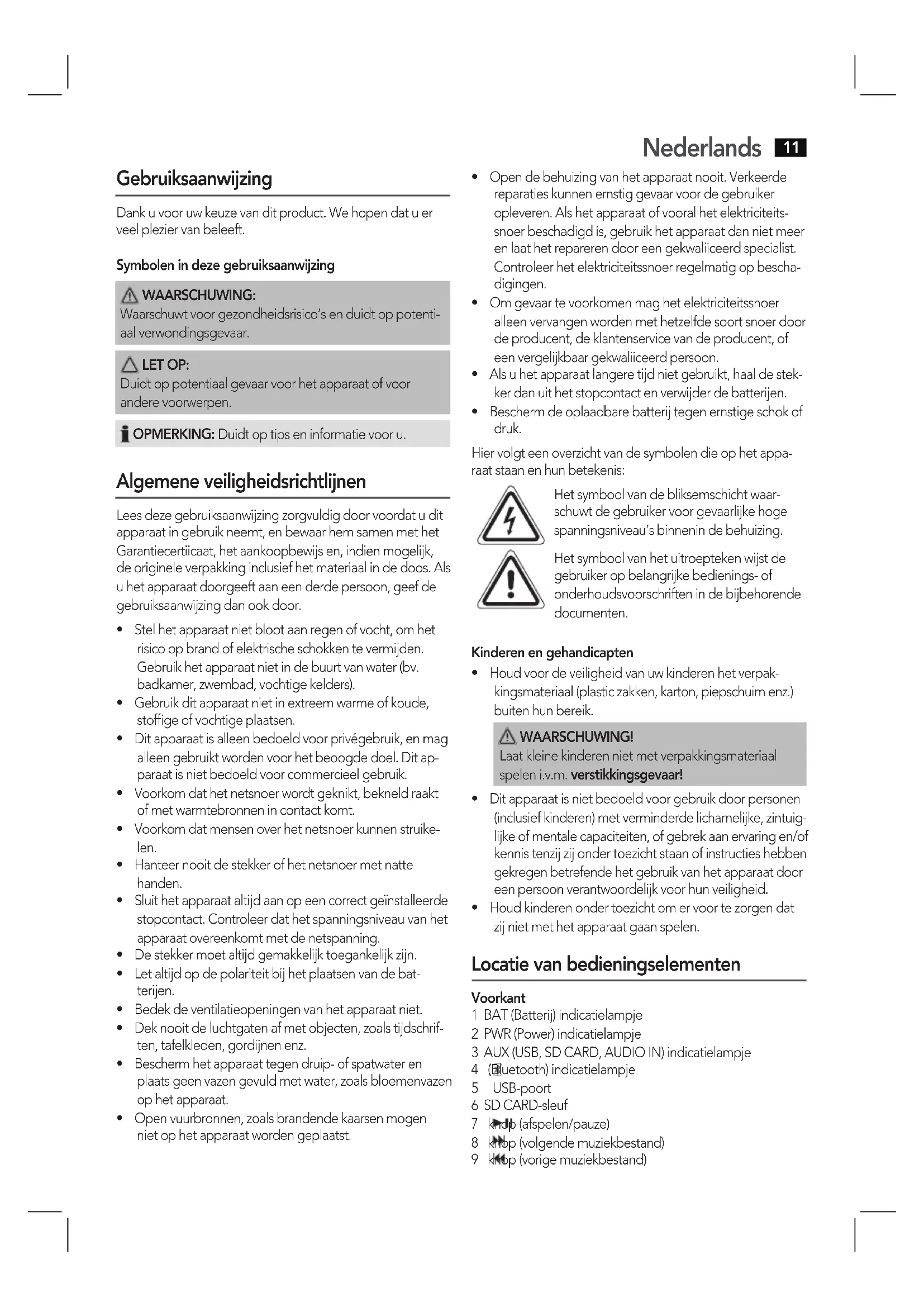 - Houdkinderenondertoezichtomervoortezorgendat zij niet met het apparaat gaan spelen. Locatie van bedieningselementen Voorkant 1 BAT (Batterij) indicatielampje 2 PWR (Power) indicatielampje 3 AUX (USB, SD CARD, AUDIO IN) indicatielampje 4 (Bluetooth) indicatielampje 5 USB-poort 6 SD CARD-sleuf 7 knop (afspelen/pauze) 8 knop (volgende muziekbestand) 9 knop (vorige muziekbestand)Nederlands